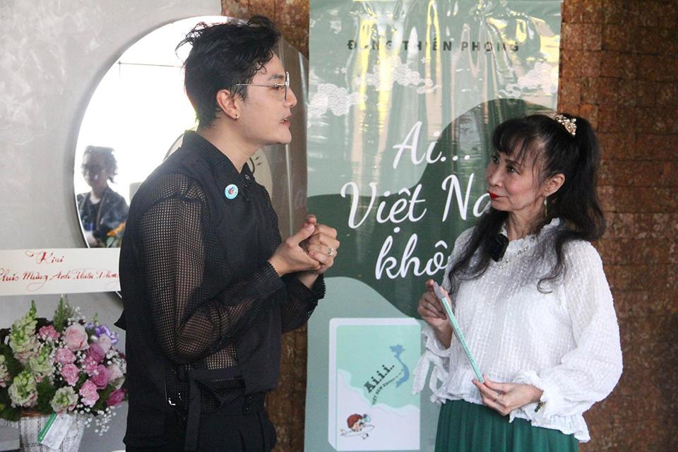 Nhà văn Đặng Thiên Phong (trái) chia sẻ về tác phẩm của mình với Nhà văn Hoài Hương. Ảnh: NVCC |