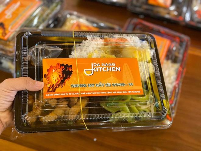 | Những suất ăn này thậm chí còn được in nhãn riêng, với thông điệp "chung tay đẩy lùi COVID-19. (Ảnh: FB Danang Kitchen) |