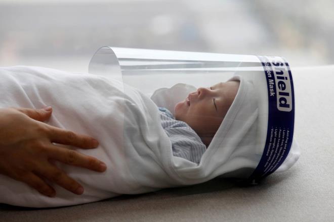 Bé sơ sinh Phúc An đeo tấm chắn giọt bắn trong đợt bùng phát coronavirus ở Hà Nội, Việt Nam, ngày 13/4. Ảnh: Nguyễn Huy Khâm/Reuters |