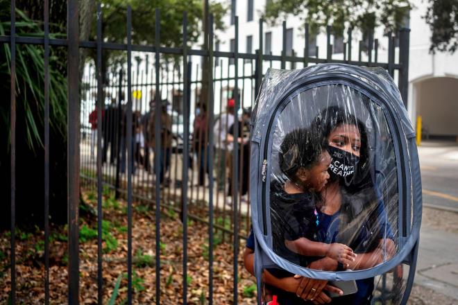 Dana Clark và con trai 18 tháng tuổi trùm túi nhựa bảo vệ khi xếp hàng bên ngoài Tòa thị chính New Orleans (Mỹ) để chờ bỏ phiếu. Ảnh: Reuters |