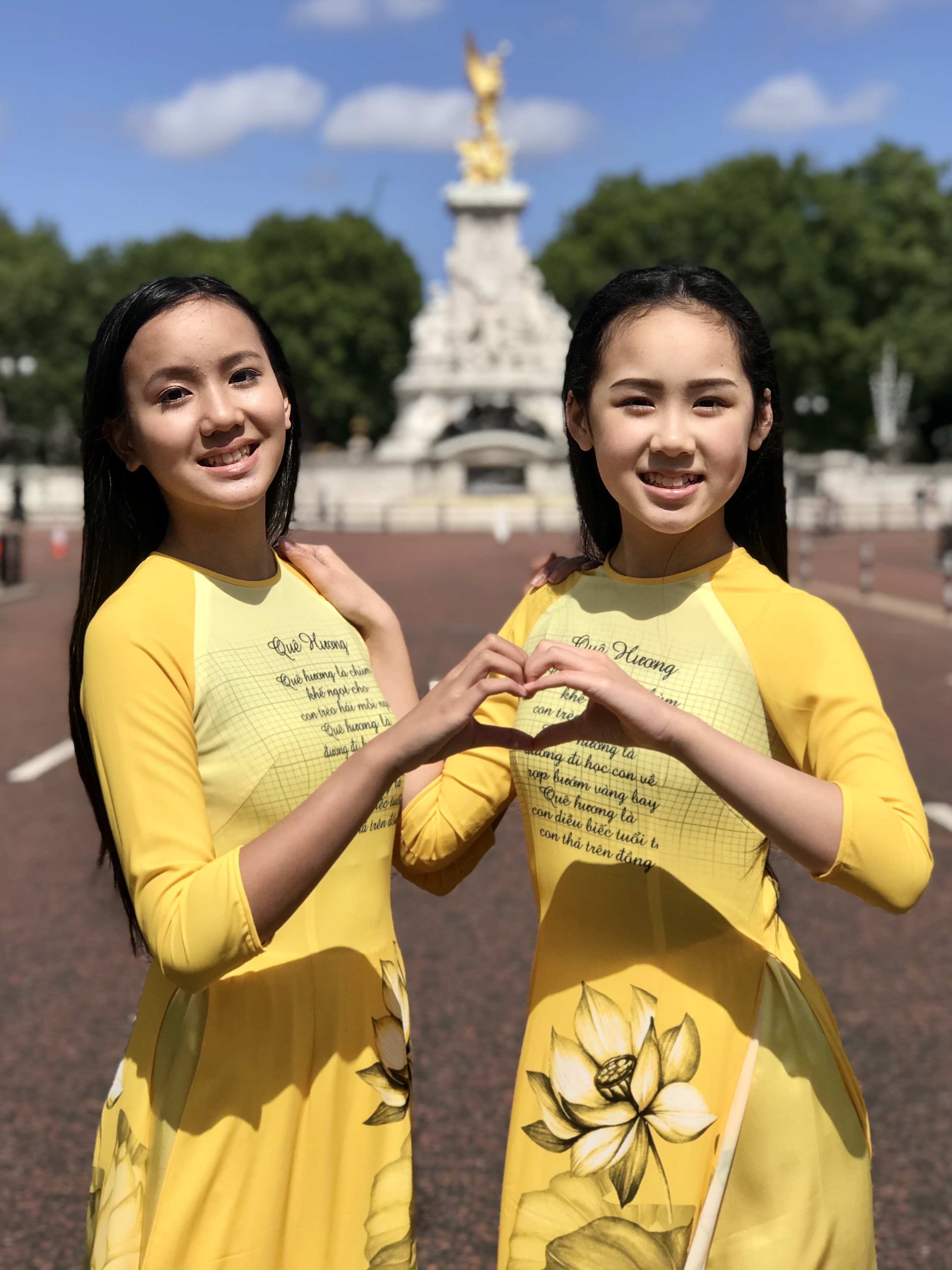Sử dụng họa tiết hoa sen – biểu tượng của Việt Nam trong thiết kế của mình, hai cô bé gốc Việt muốn truyền đi thông điệp về sự lạc quan và tích cực rằng thế giới sẽ vượt qua giai đoạn khó khăn này. Dòng chữ “quê hương” trên áo và khung cảnh trước cung điện Buckingham là sự hoà quyện và thể hiện rõ nhất tình cảm của hai dân tộc bởi một màu vàng rực rỡ.