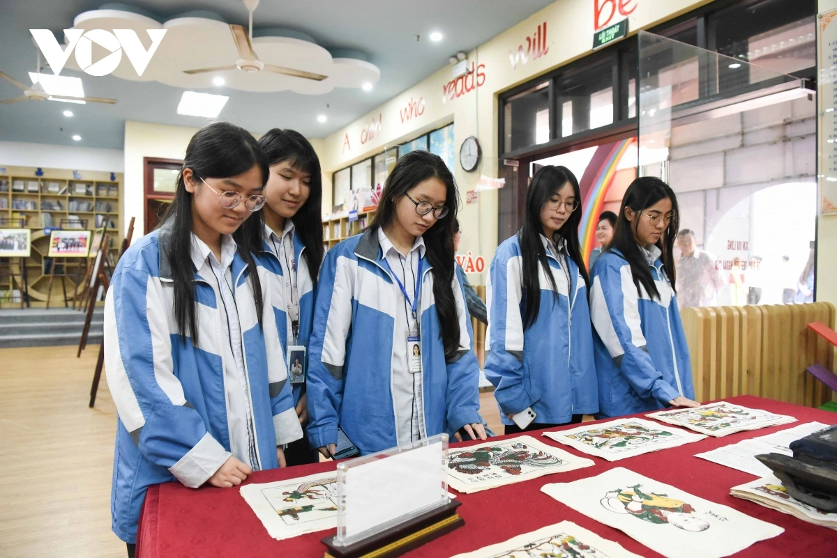 Các em học sinh tham quan với tư liệu di sản tranh dân gian Đồng Hồ của Bắc Ninh.