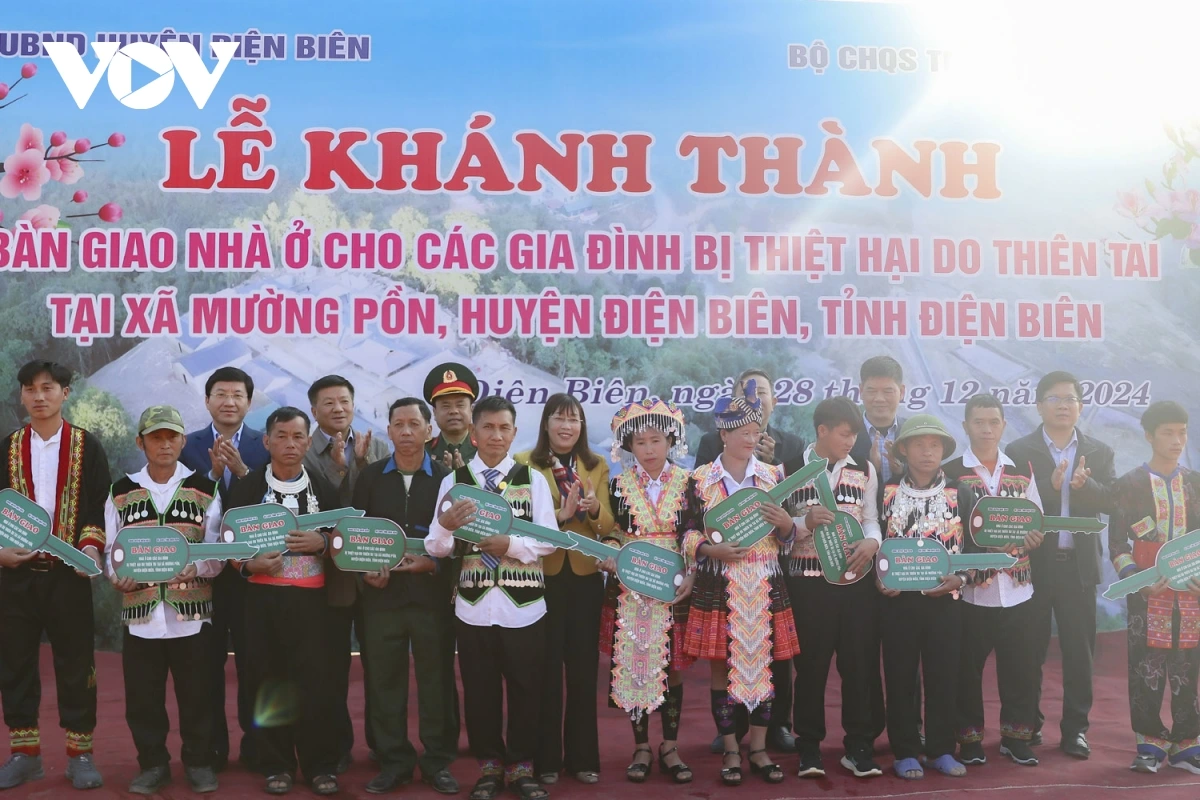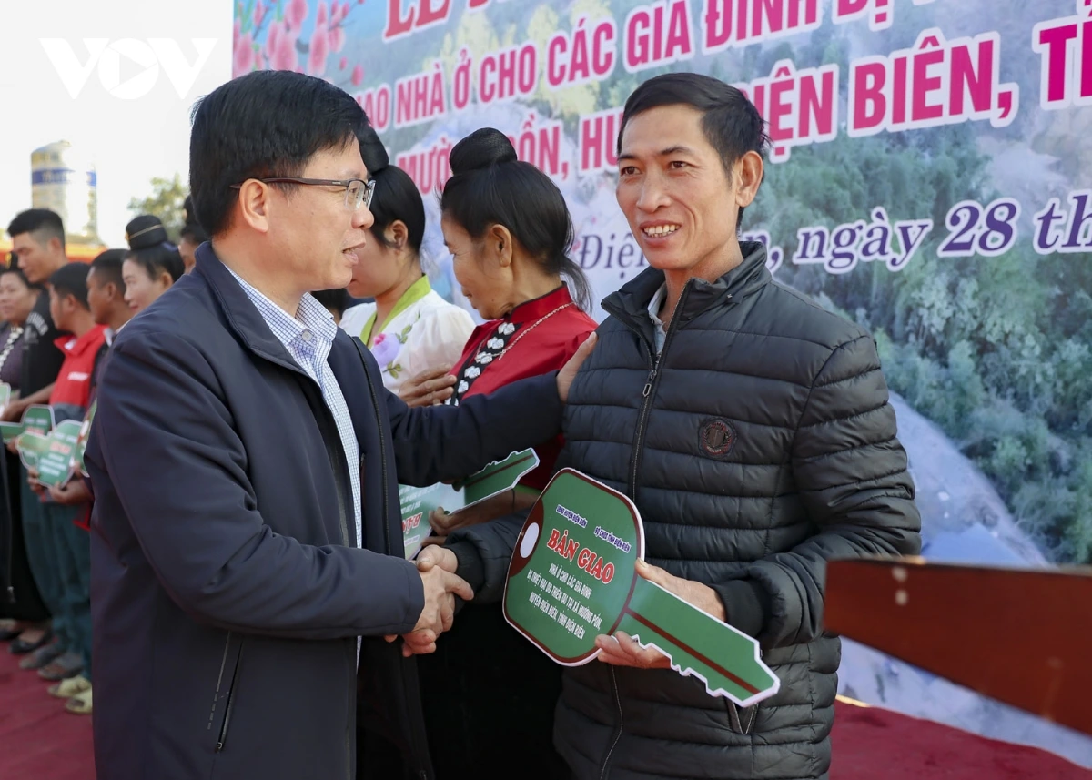 | Ông Phạm Đức Toàn, Phó Chủ tịch UBND tỉnh Điện Biên trao biểu tượng chìa khóa nhà cho người dân Mường Pồn. |