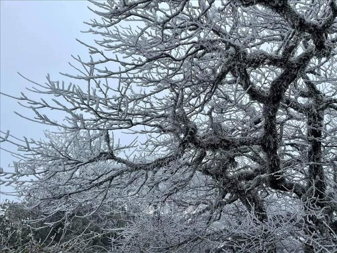 Những cành cây phủ đầy băng giá trên đỉnh núi Phia Oắc. |