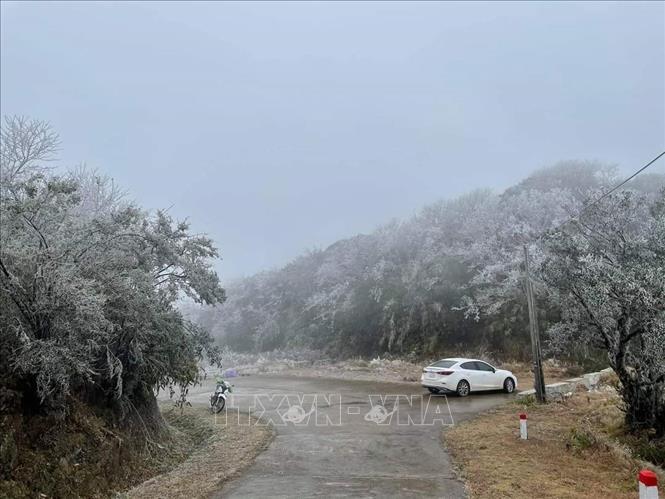 Đỉnh núi Phia Oắc phủ một màu trắng của băng tuyết, giống như phong cảnh ở Châu Âu. |