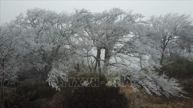 Những cành cây trên đỉnh núi Phia Oắc phủ màu trắng của băng tuyết, trông xa như những cành hoa mận trắng bung nở. |