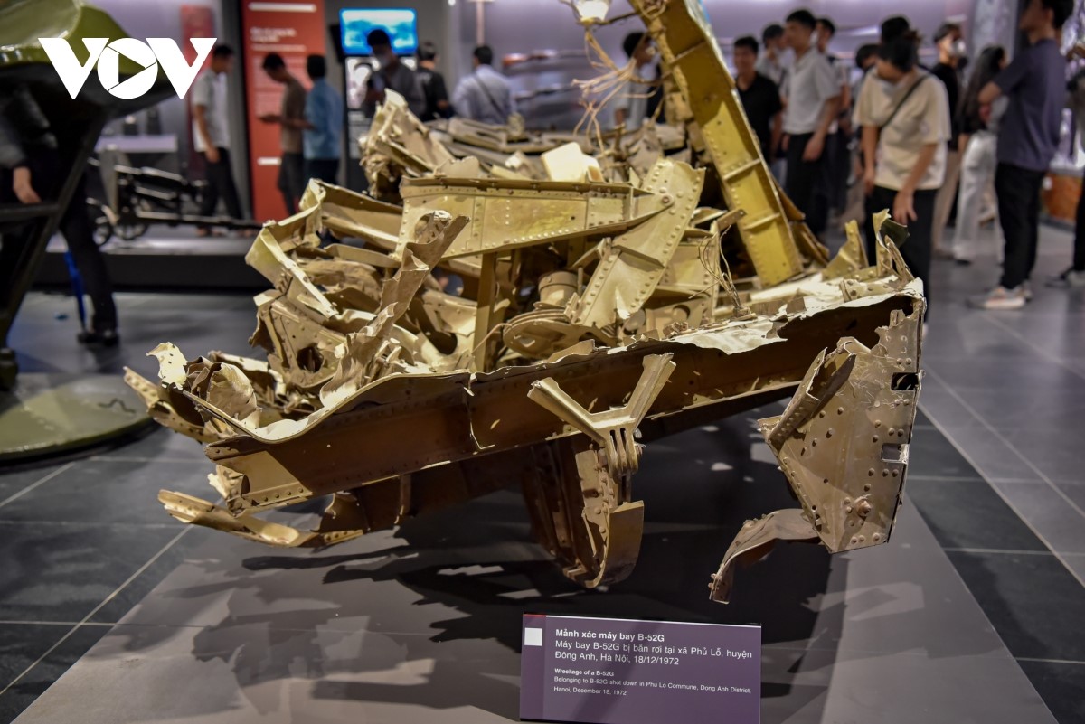 Hiện vật "Mảnh xác máy bay B-52G bị bắn rơi tại Hà Nội năm 1972" được trưng bày tại bảo tàng. |