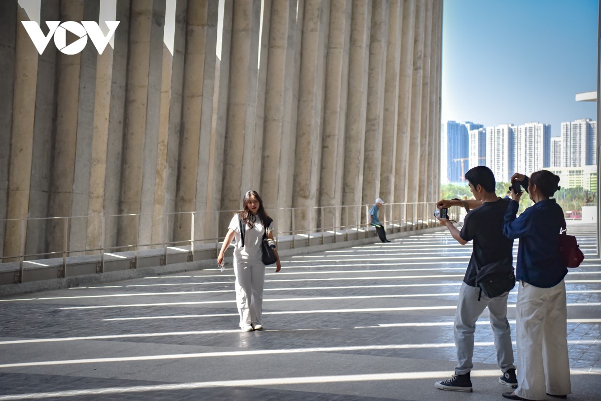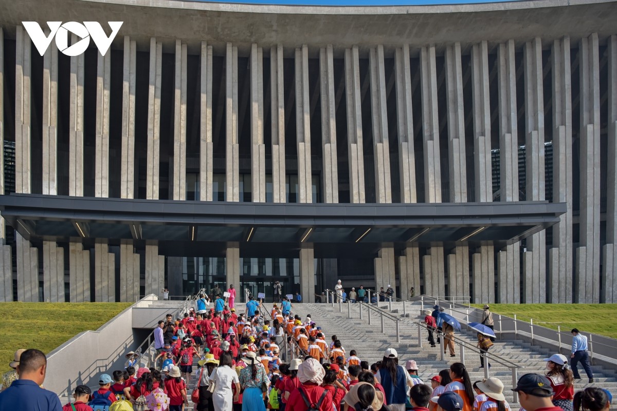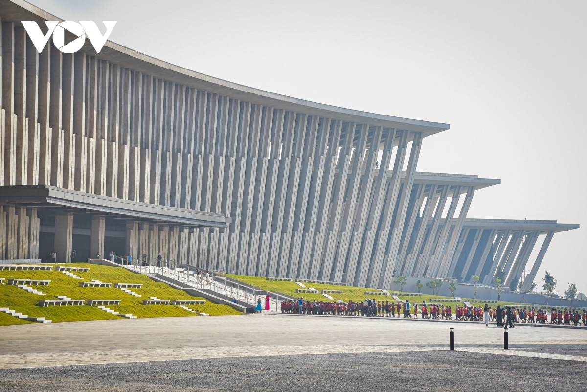 Du khách chụp ảnh, check-in phía bên ngoài bảo tàng. |