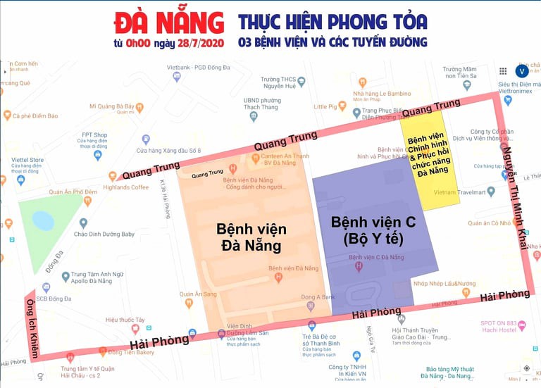 | Đà Nẵng thực hiện phong tỏa 3 bệnh viện: Bệnh viện C (Bộ Y tế), Bệnh viện Đà Nẵng, Bệnh viện Chỉnh hình và Phục hồi chức năng Đà Nẵng và phong tỏa khu vực các tuyến đường mặt trước, sau và bên cạnh bệnh viện. Bắt đầu thực hiện từ 0h ngày 28/7 đến khi có thông báo mới. |