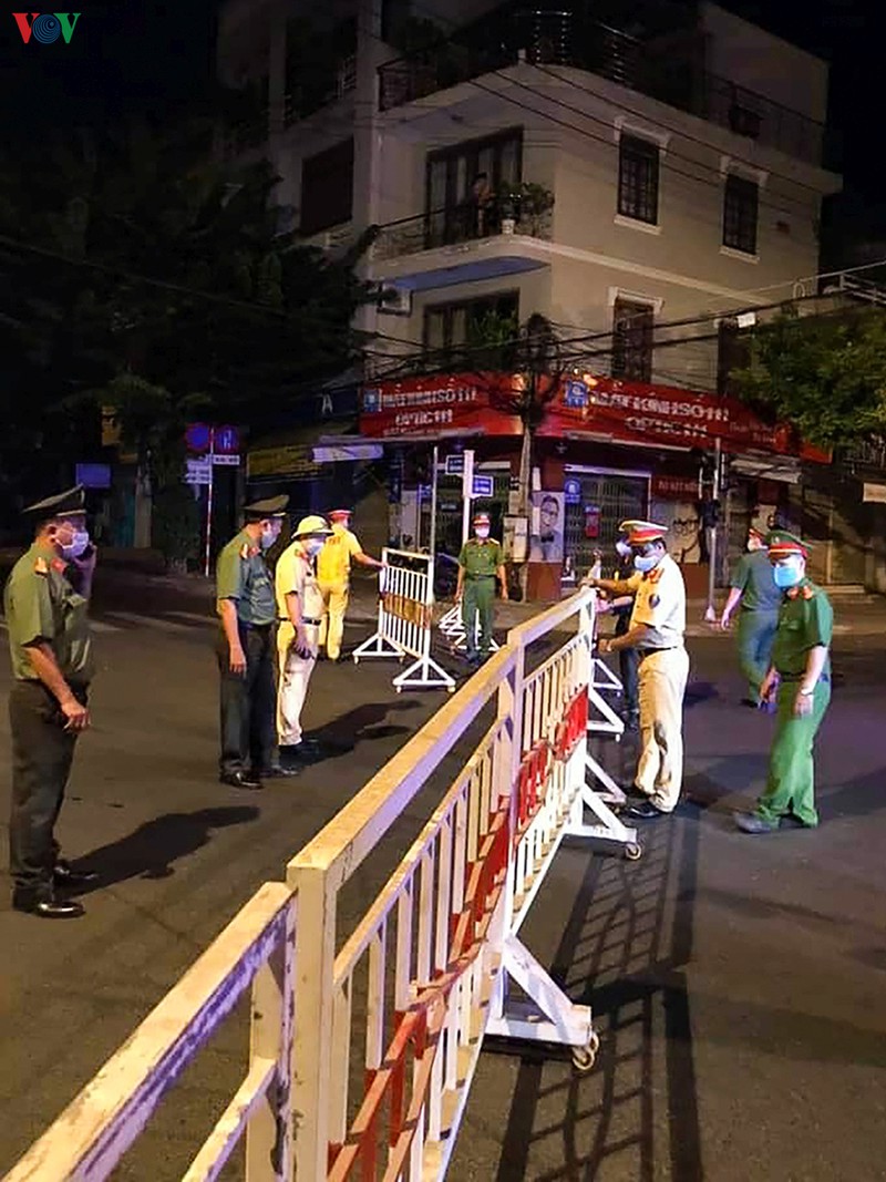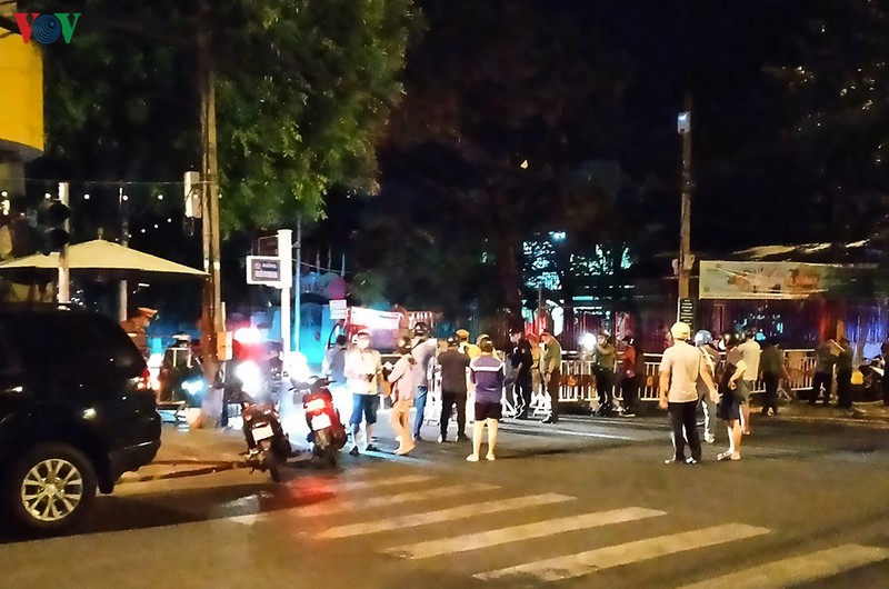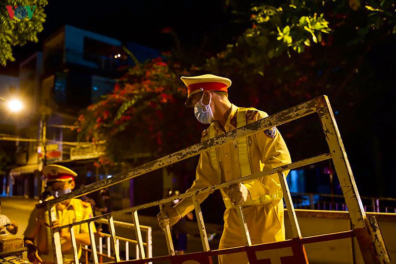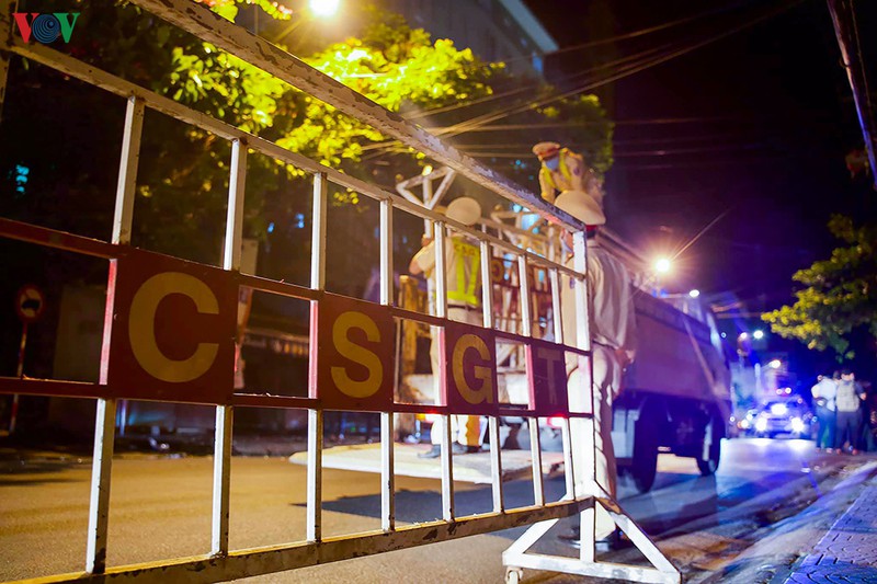 Lực lượng CSGT Công an Đà Nẵng triển khai rào chắn trên đường Hải Phòng, đường Quang Trung- khu vực cổng chính và cổng sau Bệnh viện C Đà Nẵng vào đêm 27/7. |