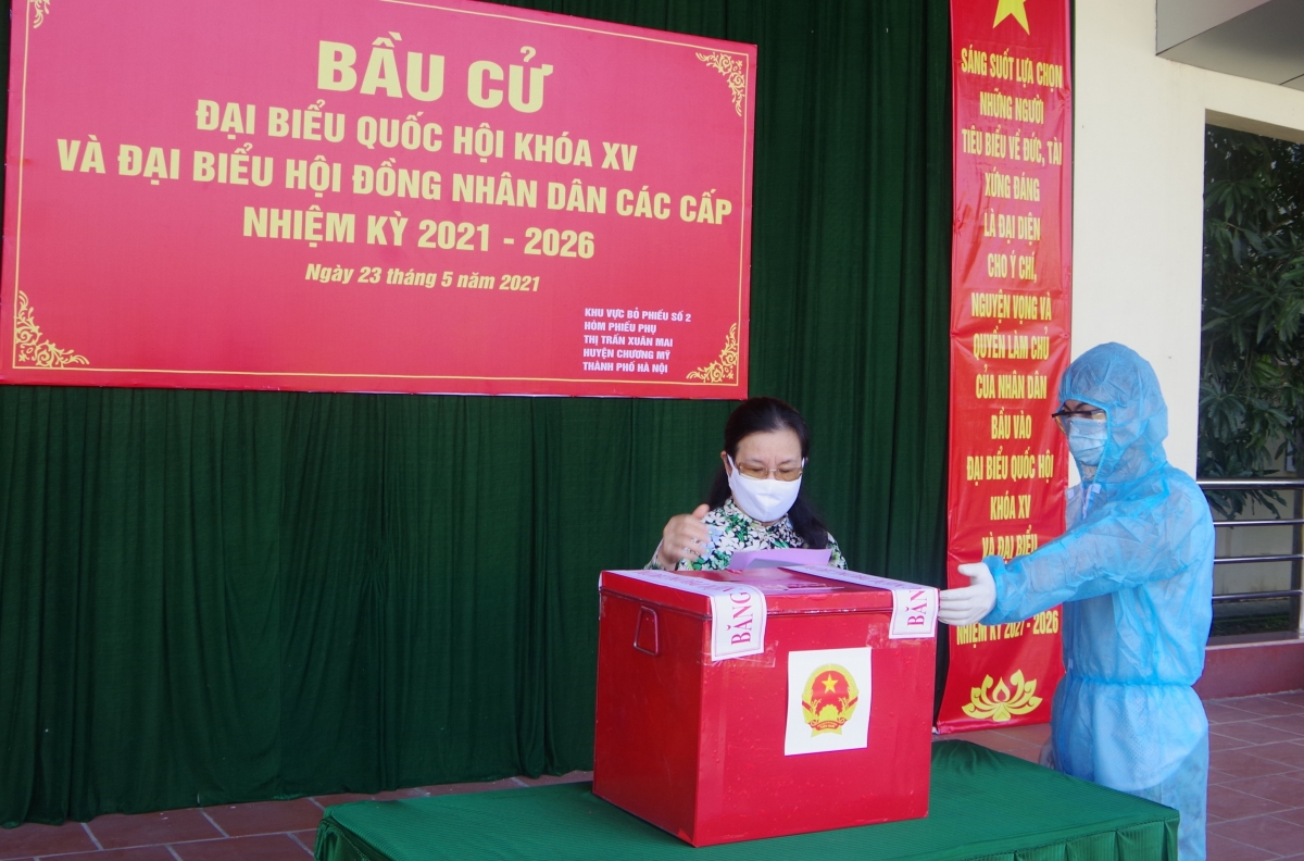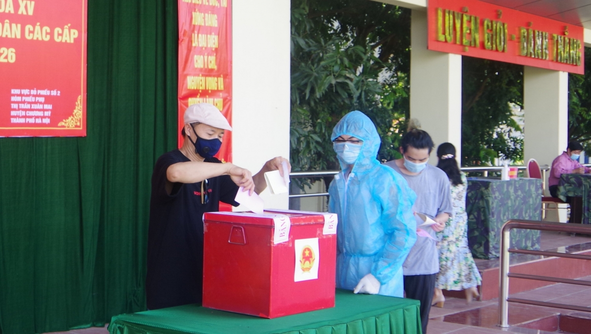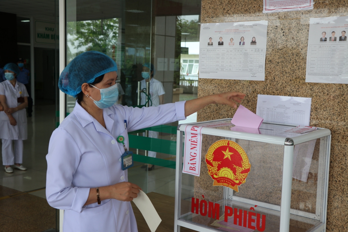 Sáng 23/5, hơn 700 bác sĩ, nhân viên y tế, bệnh nhân ở tâm dịch COVID-19 tại Bệnh viện Bệnh Nhiệt đới Trung ương (Kim Chung, Đông Anh) đã bầu cử ngay tại Bệnh viện.