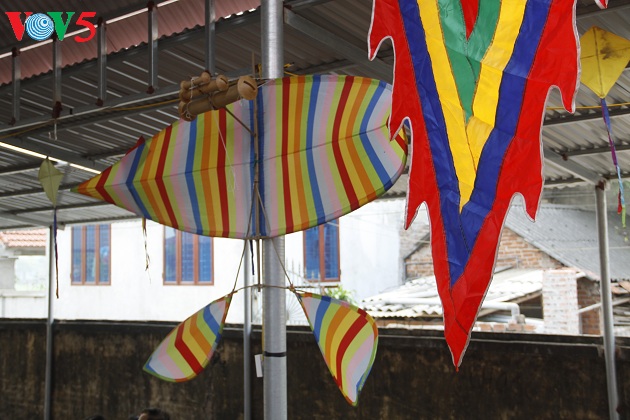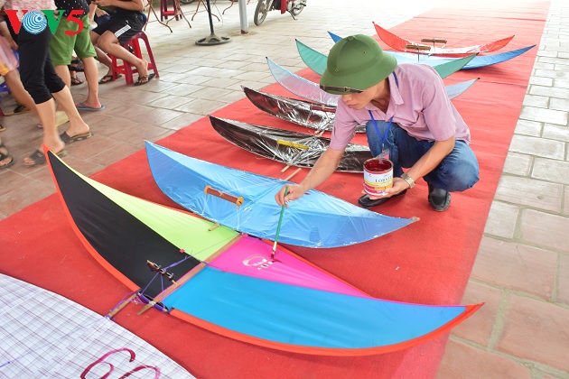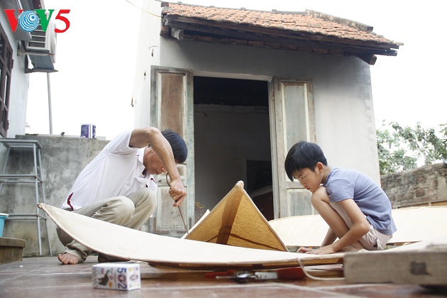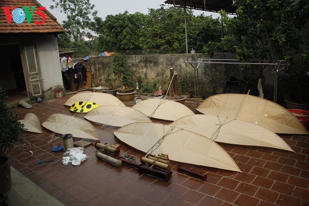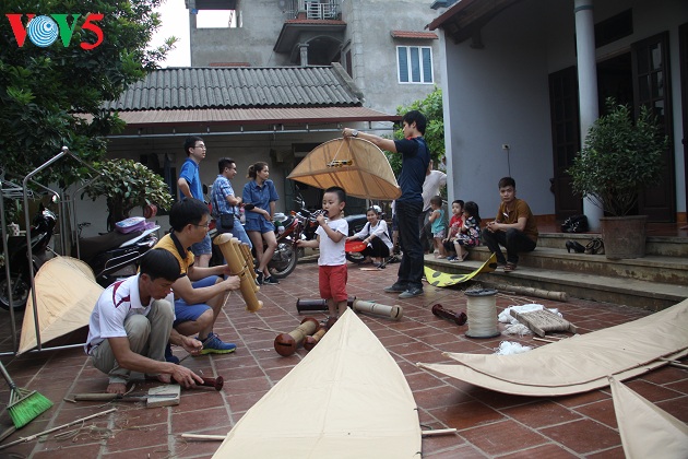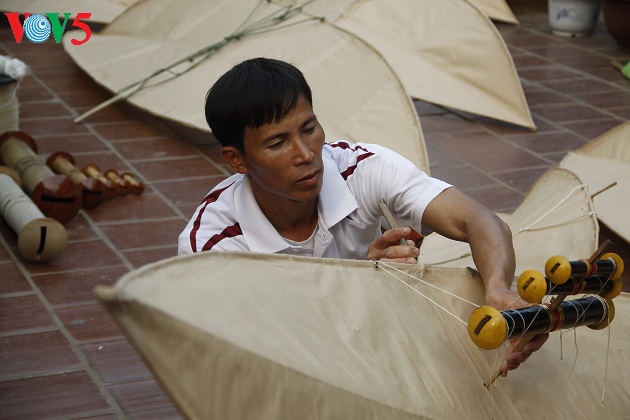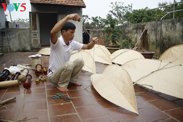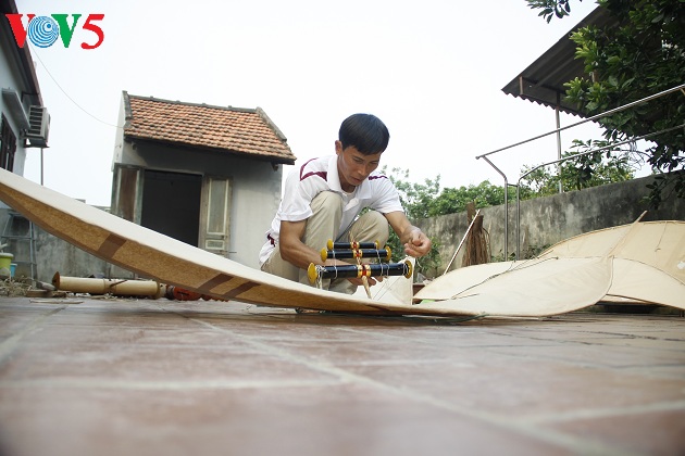 | Năm nay anh Quyết làm 5 con diều để tham gia cuộc thi. Chỉnh dây lèo, lắp dàn sáo là những công đoạn cuối cùng để hoàn chỉnh con diều. |