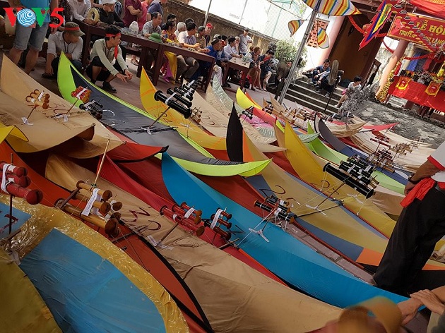 | Những chiếc diều được chuẩn bị công phu hàng tháng đã sẵn sàng tham gia hội thi. Những cánh diều tham dự tối thiểu dài 2,2m, bên trên có gắn từ 3 ống sáo trở lên. |