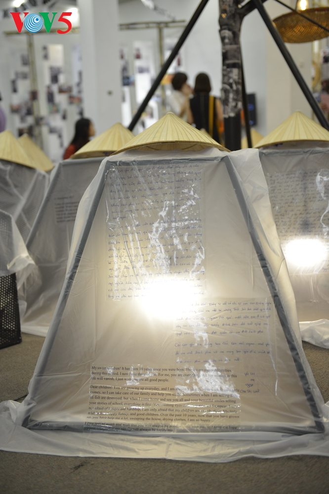 | Nhưng bức thư viết tay được thể hiện dưới ánh sáng, áo mưa và chiếc nón lá đặc trưng |