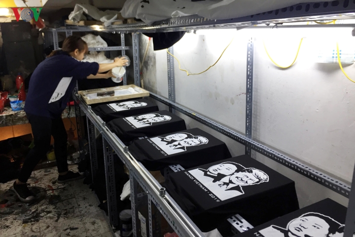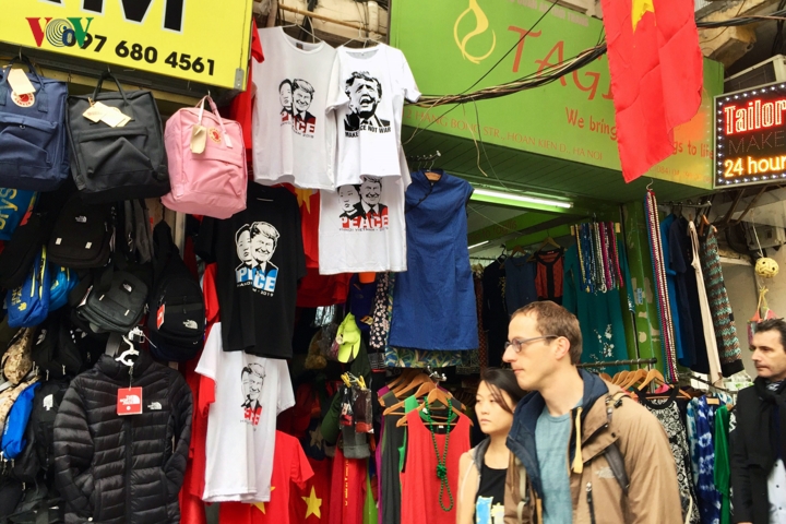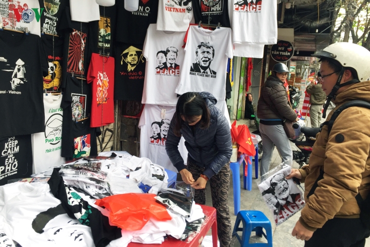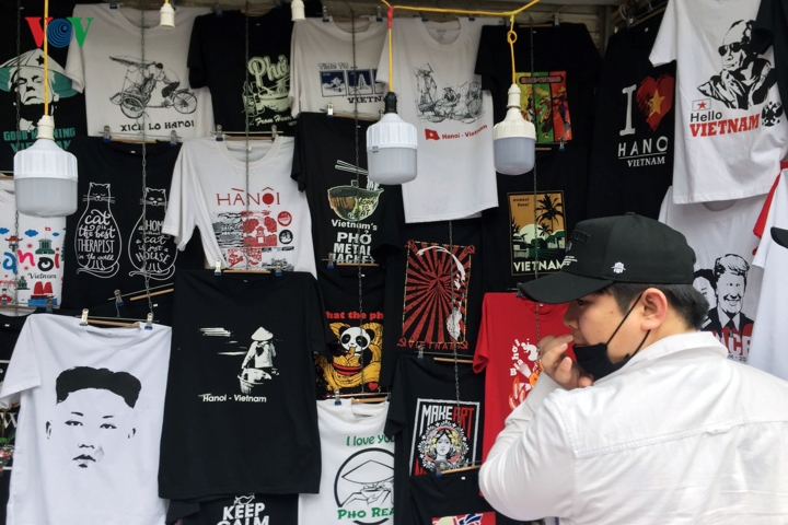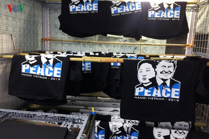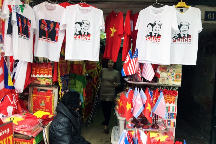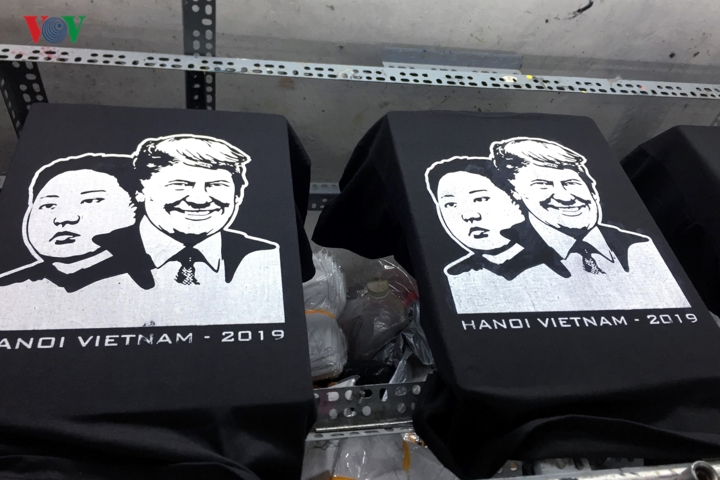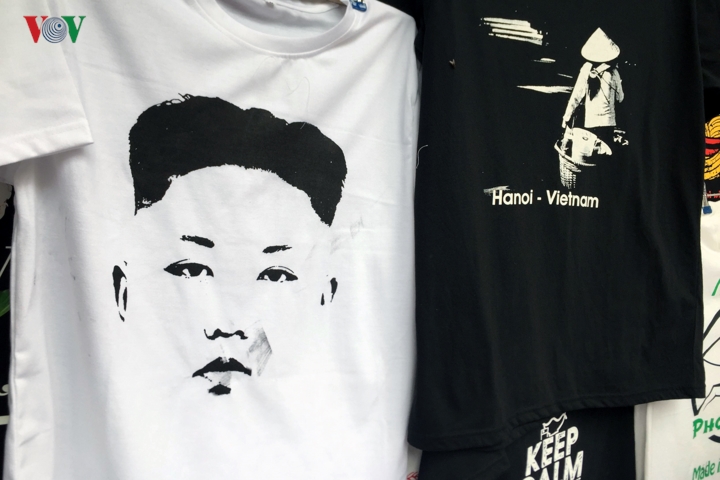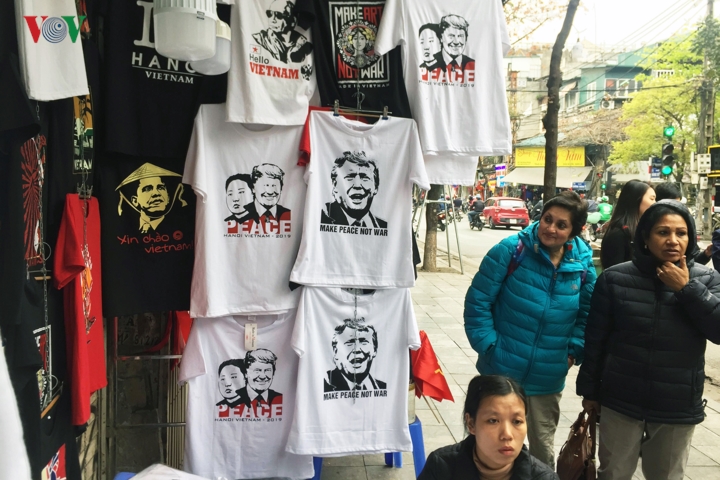 Trước thềm Hội nghị thượng đỉnh Mỹ - Triều tại Hà Nội, trên tuyến phố hàng Bông, Hà Nội, nhiều cửa hàng đã tranh thủ bán những chiếc áo phông in hình ông Donald Trump và Kim Jong Un cùng thông điệp hòa bình.