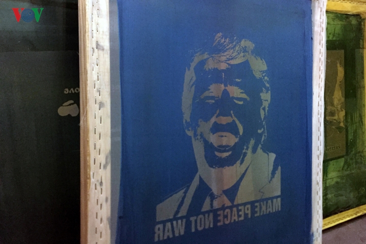 Ông Trương Thanh Đức, chủ cửa hàng quần áo trên phố hàng Bông với chiếc áo in hình Tổng thống Mỹ cùng thông điệp về hòa bình.