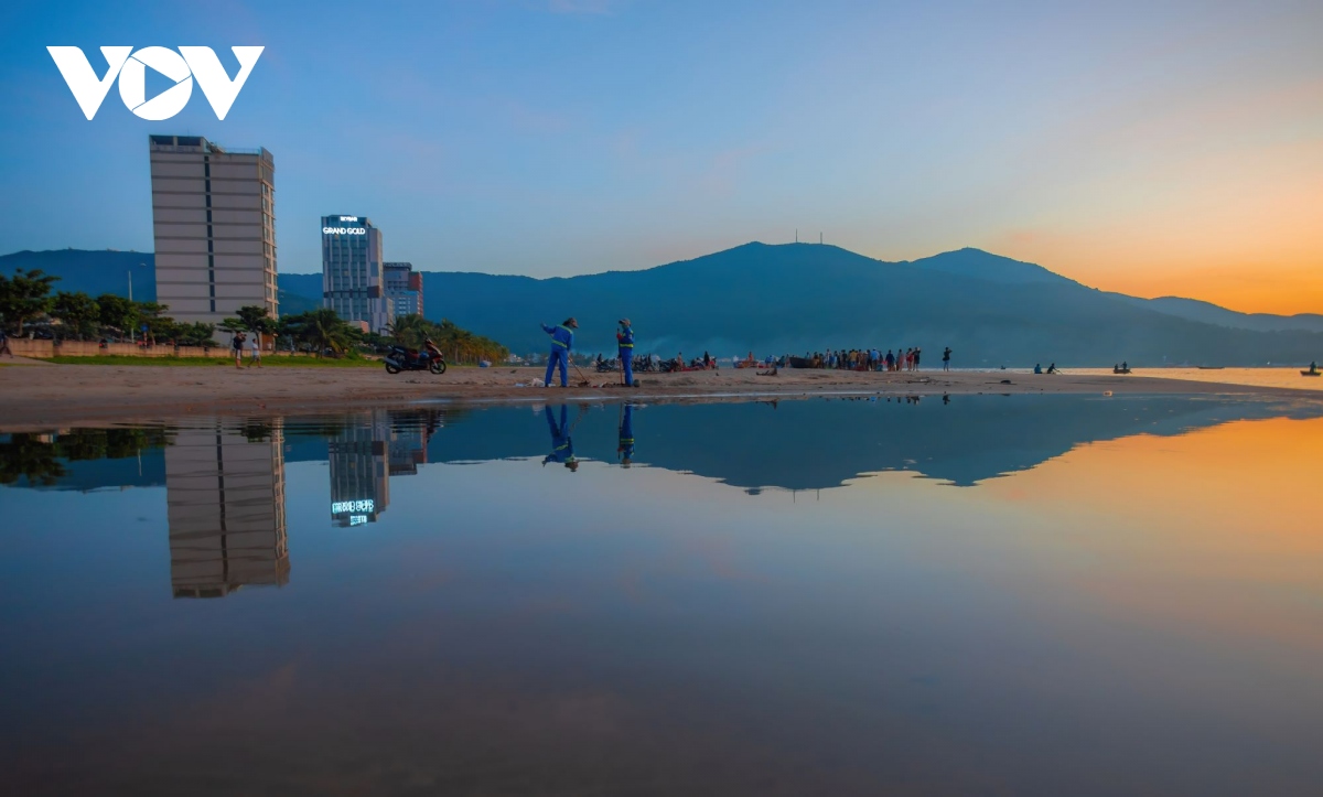 Các công nhân môi trường cũng bắt đầu một ngày làm việc để giữ gìn vệ sinh sạch đẹp cho bãi biển. |