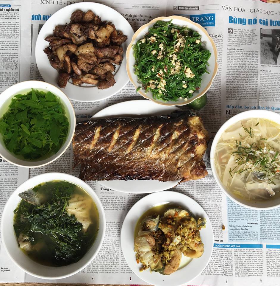 | Mâm cơm với những món ăn đặc trưng nơi đây: cá nheo hồ nướng khói, thịt lợn mán rang cháy cạnh, rau dớn xào tỏi hoặc làm nộm, măng trúc nấu đầu cá nheo, rau ngót rừng nấu xuông, giảo cổ lam nấu cá nheo. |