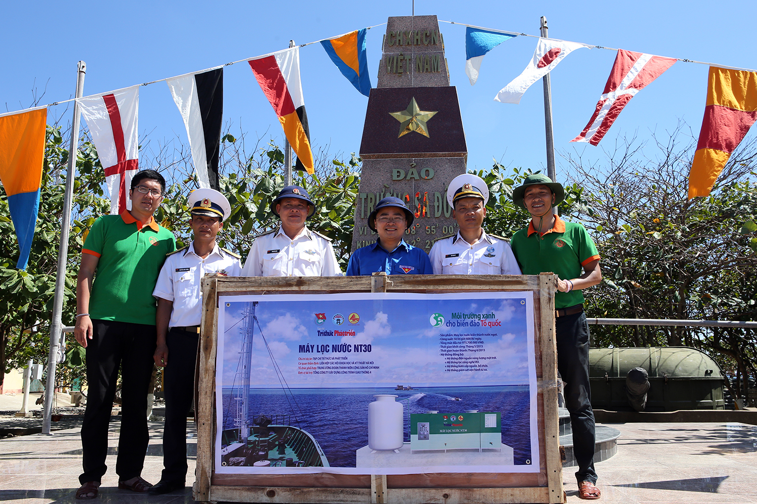 Triển lãm gồm 3 phần: Sức sống Trường Sa, Sắc màu tuổi trẻ, Chủ quyền biển đảo. Tác phẩm: Tặng máy lọc nước cho Trường Sa - Tác giả Lê Lâm |