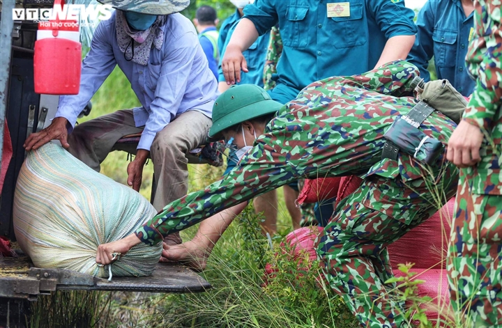 Sau khi gặt lúa xong, lúa được cho vào bao, các chiến sĩ thay nhau vác lúa từ ruộng vào lề đường cách đó khoảng 200m giúp người dân.
