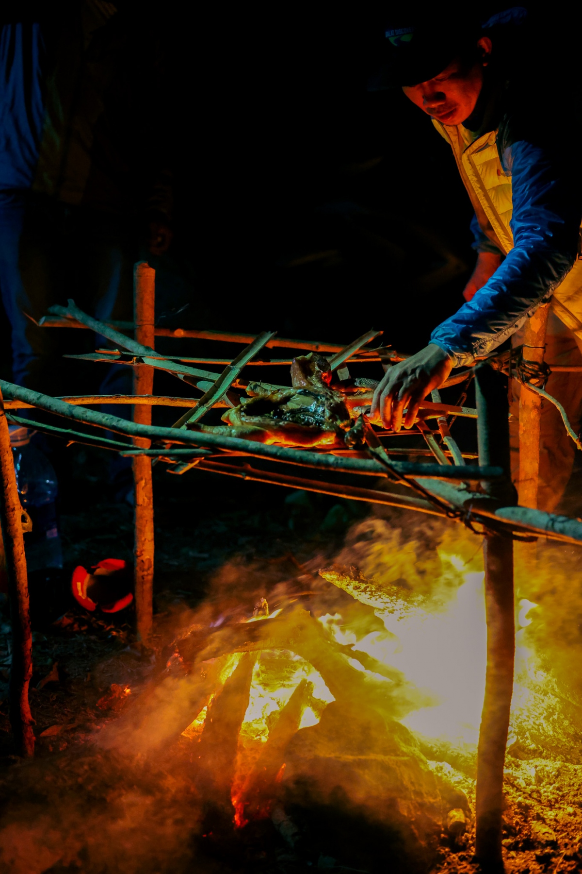 Khi trời đã dần tối, cả đoàn cùng nhau nướng gà, nướng thịt, nướng cá vừa câu dưới hồ lên. Ở đây không có sóng 4G nên mọi người nói chuyện với nhau nhiều hơn. Sau bữa ăn, tất cả lại cùng nhau dọn sạch rác.
