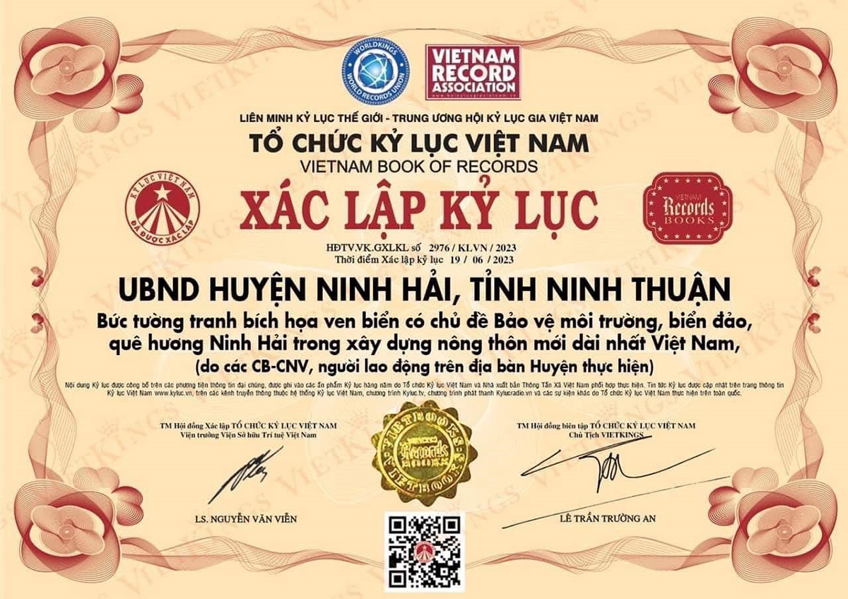 Tác phẩm này mới được Tổ chức kỷ lục Việt Nam xác lập “Bức tường tranh bích họa ven biển có chủ đề Bảo vệ môi trường, biển đảo, quê hương Ninh Hải trong xây dựng nông thôn mới dài nhất Việt Nam”. Ảnh: FB Ninh Thuận Ngày Mới |