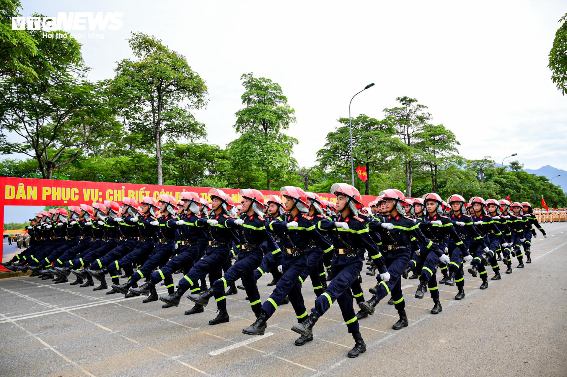| Ở một góc thao trường, khối sĩ quan Phòng cháy chữa cháy luyện đi đều trong tư thế nhanh gọn – đặc trưng của lực lượng phản ứng khẩn cấp. |