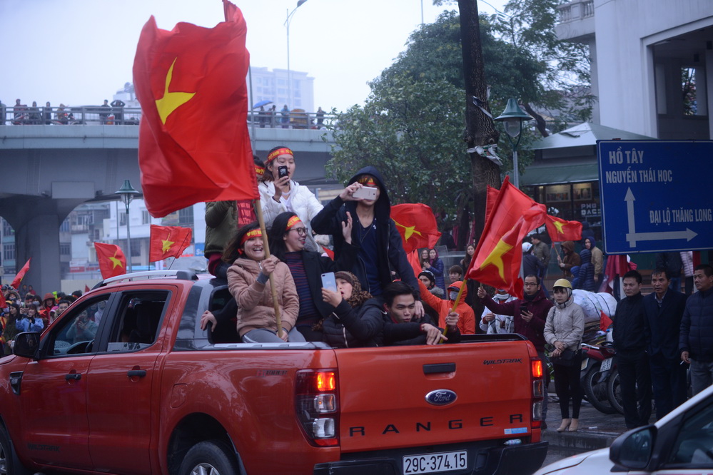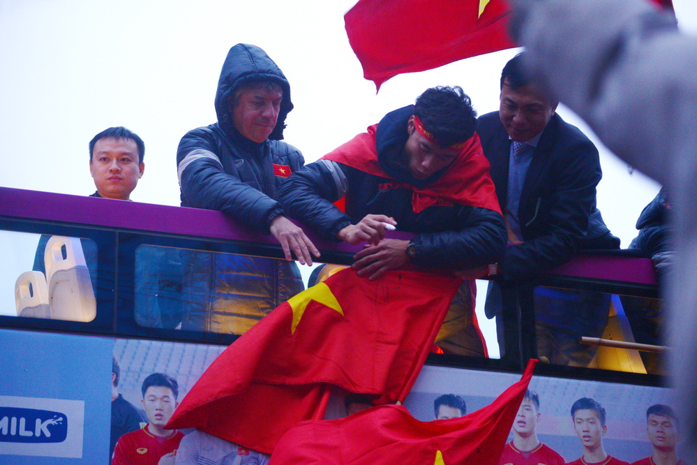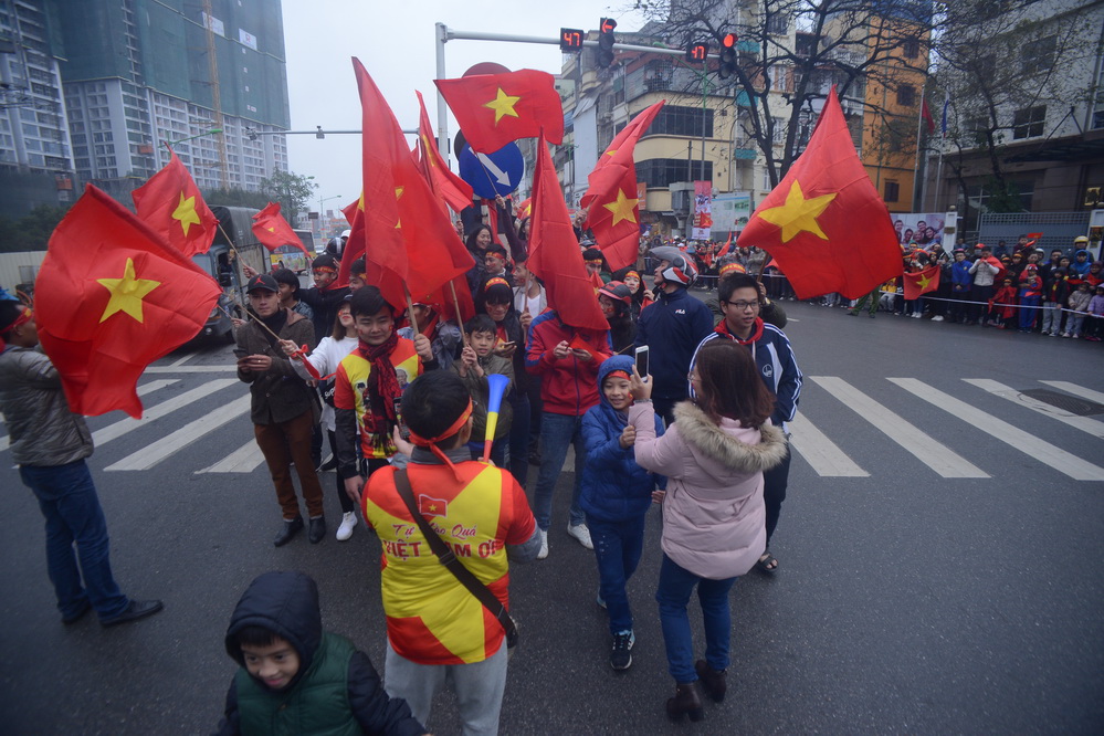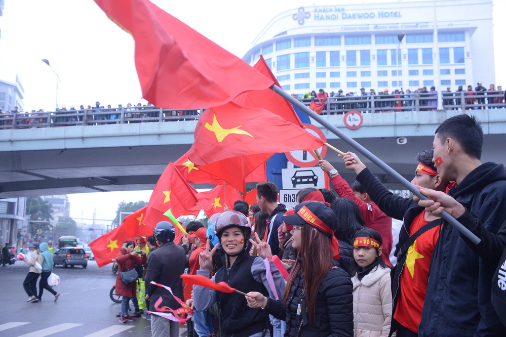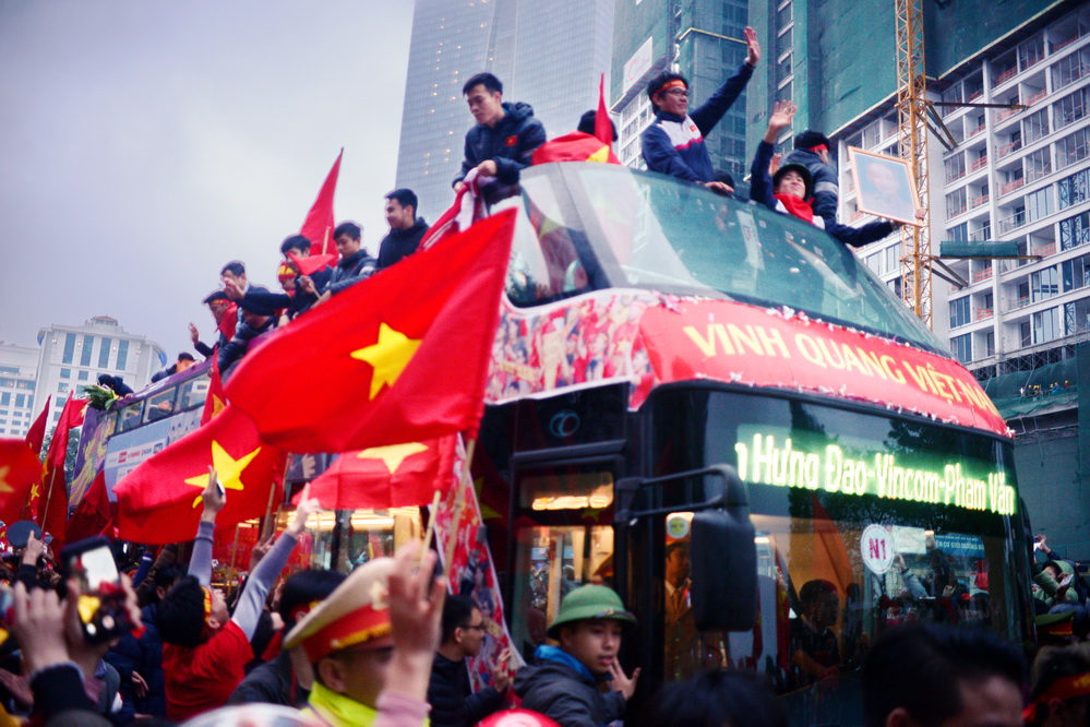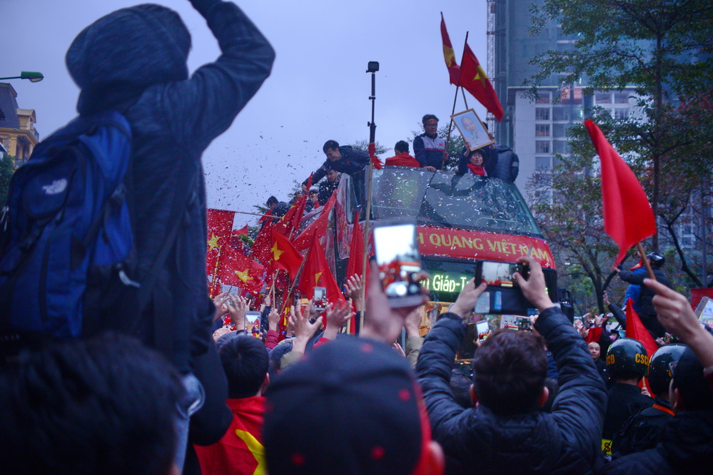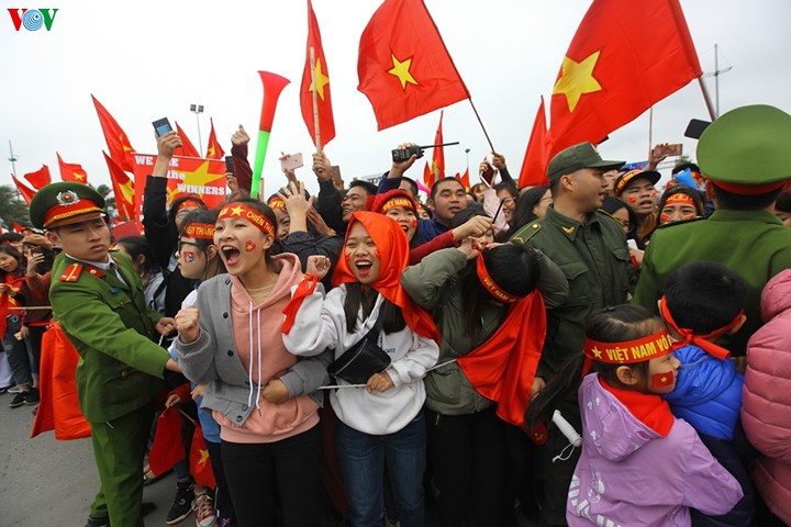 | Tại các tuyến đường xe bus 2 tầng chở đội tuyển đi qua, hàng vạn cổ động viên đã đứng đợi kín. (ảnh: Đức Anh/VOV5) |