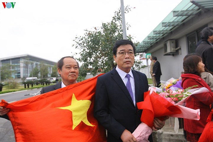 | Ông Lương Bách Chiến - bố ruột Lương Xuân Trường (cầm hoa) ra sân bay đón con trai. |