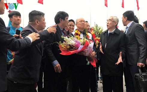 | HLV Park Hang Seo cùng các học trò bước xuống máy bay trong sự chào đón của đông đảo người hâm mộ |