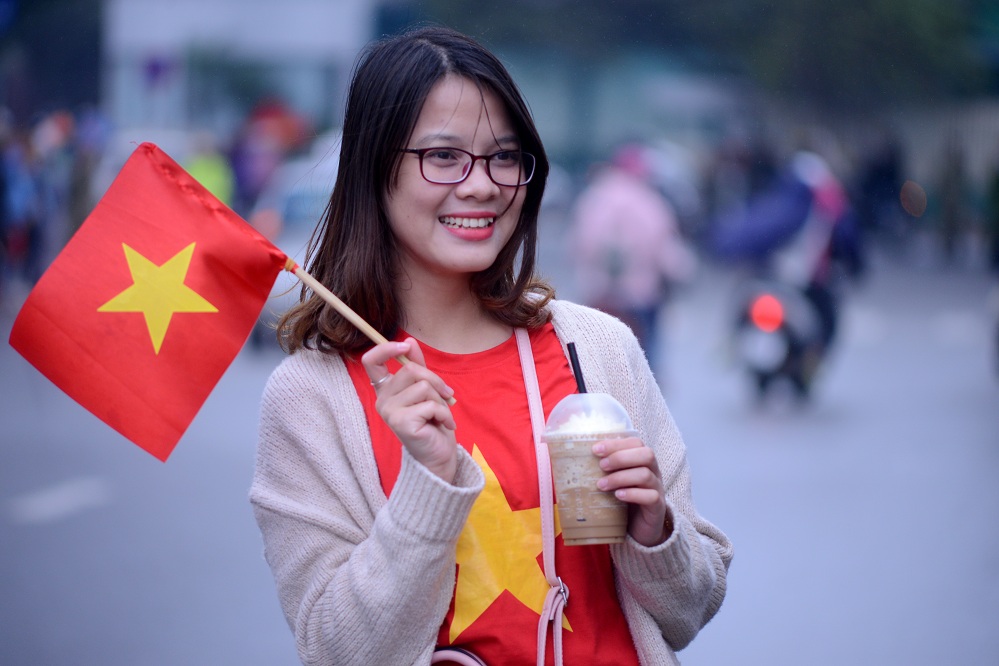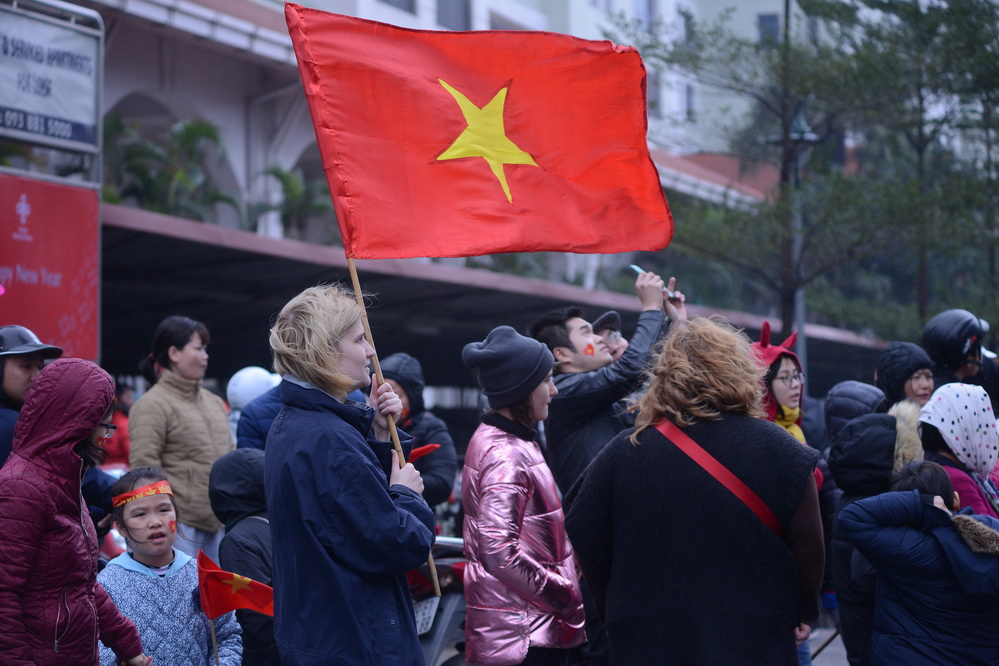 | Lá quốc kỳ Hàn Quốc, quê hương của HLV Park Hang Seo tung bay giữa rừng cờ đỏ sao vàng.(ảnh: Đức Anh/VOV5) |