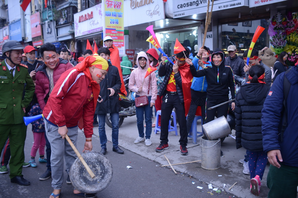 | Người dân dùng cả nồi, mâm, nắp vung để khua, gõ tạo nên âm thanh rộn ràng chào đón đội tuyển.(ảnh: Đức Anh/VOV5) |