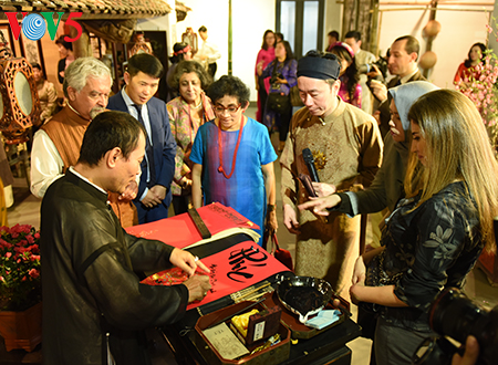 Cầm trong tay bức thư pháp vừa được một thầy đồ trẻ viết tặng, Đại sứ đặc mệnh toàn quyền Nga Vnukov Konstantin vui vẻ cho biết: “Tôi rất vui và thấy mình thật may mắn được tham dự một hoạt động thú vị ngày hôm nay. Ý tưởng mời phái đoàn gồm các đại sứ và các nhà ngoại giao nước ngoài khám phá nét văn hóa phố cổ Hà Nội rất là hay. Chúng tôi đã được đi thăm một số ngôi đền ở phố cổ. Trong tay của tôi có chữ Phúc tức là hạnh phúc vừa được thầy đổ viết tặng, tôi sẽ giữ gìn vì nó là biểu tượng của năm nay năm Đinh Dậu, hi vọng bức thư pháp này sẽ mang đến hạnh phúc, an khang thịnh vượng đến người dân Việt Nam cũng như người dân Nga và mọi người dân trên toàn thế giới. Xin chúc mừng tất cả mọi người nhân dịp Tết đến xuân về. Hi vọng có nhiều điều may mắn, tốt đẹp sẽ diễn ra trong năm nay. Chúc mừng năm mới!”.
