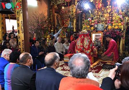 Điểm đến đầu tiên của đoàn là đền Đông Hạ, 30 Ngõ Huế, Quận Hai Bà Trưng. Tại đây, các nhà ngoại giao được tham gia một buổi hầu đồng khai xuân do đồng đền Nguyễn Tiến Nghĩa, trụ trì đền Đông Hạ hầu giá.