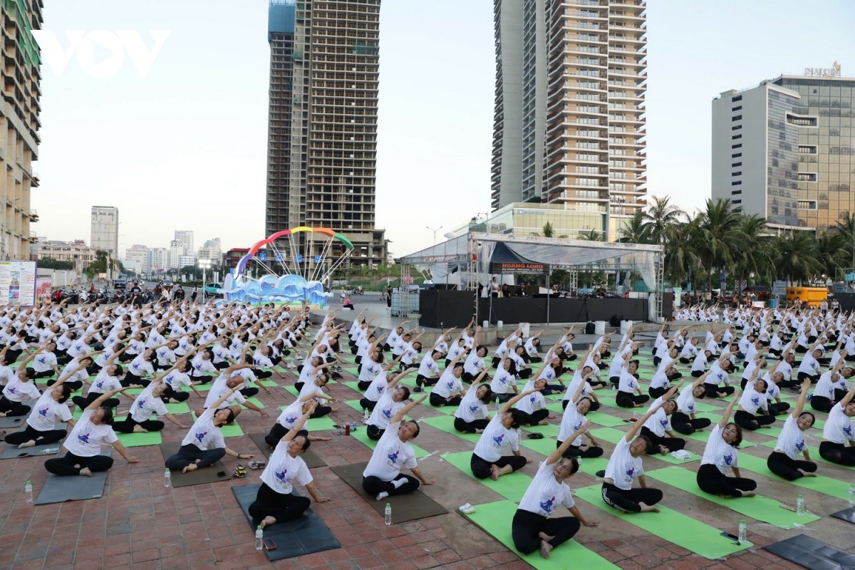 Hoạt động đồng diễn Yoga truyền đi thông điệp mạnh mẽ khuyến khích lối sống lành mạnh. Đây cũng là cơ hội để người dân và du khách kết nối với nhau thông qua hoạt động thể thao nhẹ nhàng, mang tính cộng đồng cao. Ảnh: Đình Thiệu/VOV-Miền Trung |