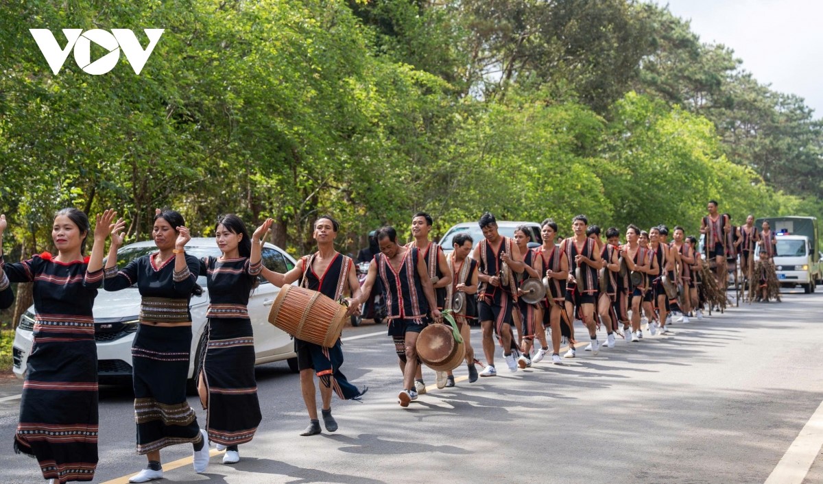 Khoảng 50 nghệ nhân tham gia diễu hành, trình diễn cồng chiêng – múa xoang trên tuyến đường thông Măng Đen sáng mùng 3 Tết. Ảnh: Thanh Thắng/VOV-Miền Trung