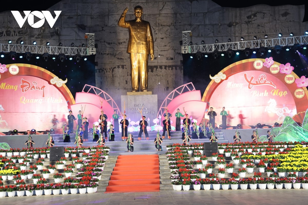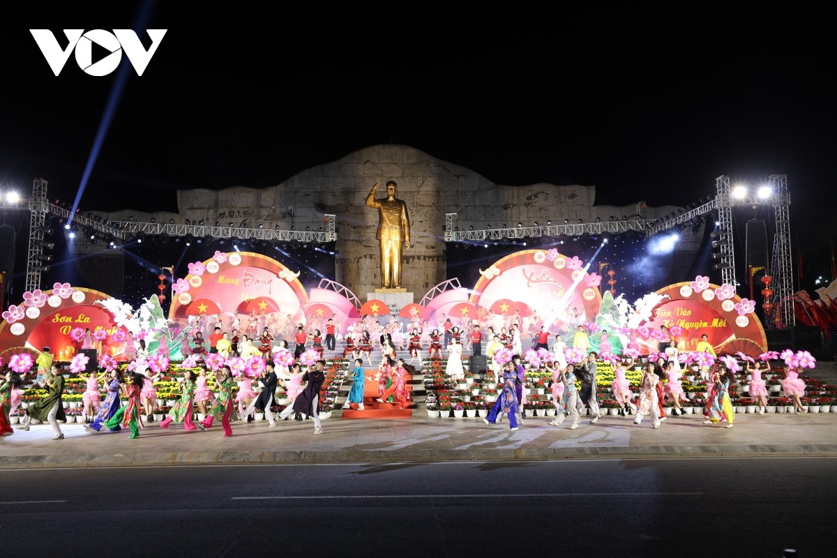 Trong không khí phấn khởi, náo nức chào đón Xuân Bính Ngọ 2026, tối 16/2, tại Quảng trường Tây Bắc, tỉnh Sơn La tổ chức chương trình nghệ thuật chào mừng kỷ niệm 96 năm Ngày thành lập Đảng Cộng sản Việt Nam (3/2/1930 - 3/2/2026) và mừng Xuân Bính Ngọ 2026. Ảnh: Thu Thùy/VOV-Tây Bắc