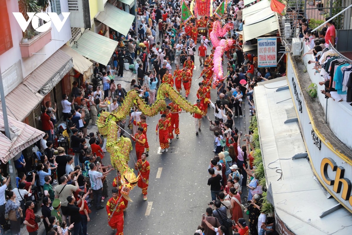 Tối 3/3, tức Rằm tháng Giêng, gần 1.200 diễn viên, nghệ nhân tham gia diễu hành đường phố nhân Lễ hội Tết Nguyên tiêu 2026 tại TP. Hồ Chí Minh (khu vực Quận 5 trước đây). Những màn lân sư rồng, biểu diễn nghệ thuật truyền thống rực rỡ sắc màu đã thu hút đông đảo người dân và du khách. Ảnh: Vũ Hường/VOV-TP. Hồ Chí Minh |