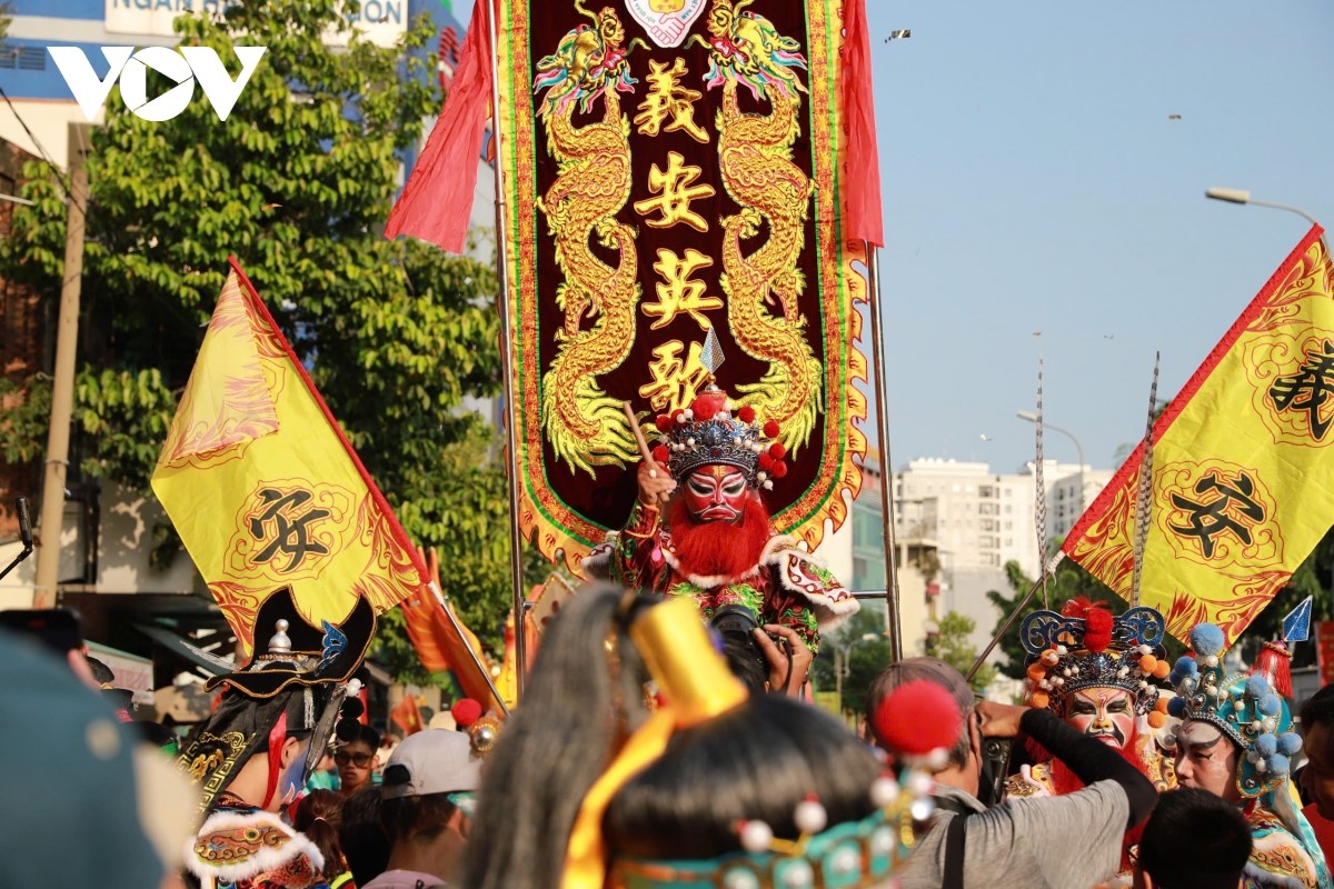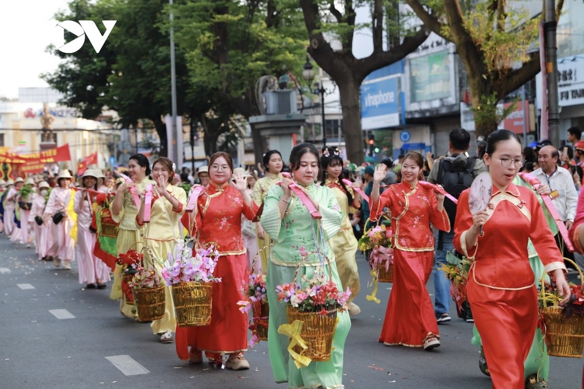 Diễu hành với sự góp mặt của các đoàn múa Lân Sư Rồng, các đội cờ phướn, ban cổ nhạc, kèn, trống, đoàn diễn viên hoá trang thành các vị tiên đi dọc các con phố. Ảnh: Vũ Hường/VOV-TP. Hồ Chí Minh |