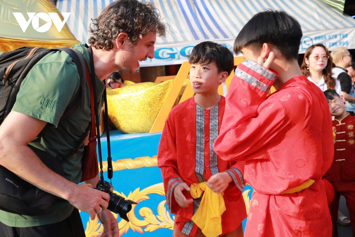 Một số người nước ngoài tò mò, trò chuyện cùng các em nhỏ trong đoàn diễu hành. Ảnh: Vũ Hường/VOV-TP. Hồ Chí Minh |
