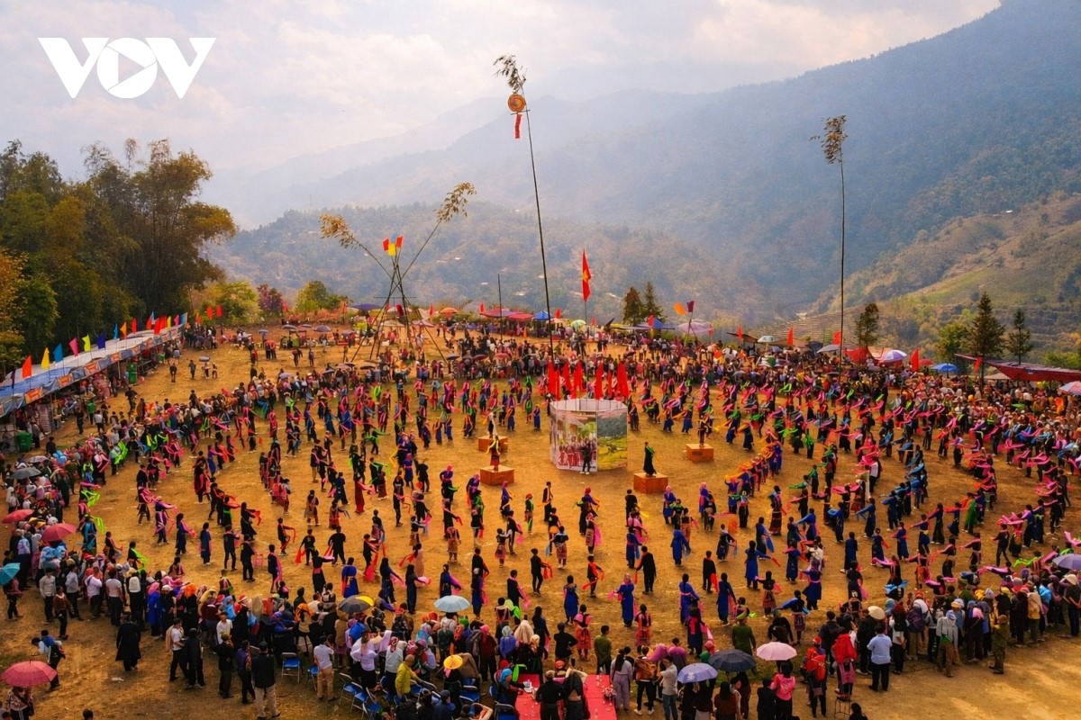 Sáng 28/2, tại xã Mường Bo (tỉnh Lào Cai), Lễ hội Sắc xuân Mường Bo năm 2026 đã chính thức khai mạc, thu hút hàng nghìn người dân và du khách. Trong trang phục thổ cẩm rực rỡ, bà con cùng nhau thực hiện các nghi thức tâm linh trang trọng như dựng cây Nêu ngày Tết, gửi gắm ước nguyện về một năm mưa thuận gió hòa, mùa màng bội thu. Ảnh: An Kiên/VOV-Tây Bắc |