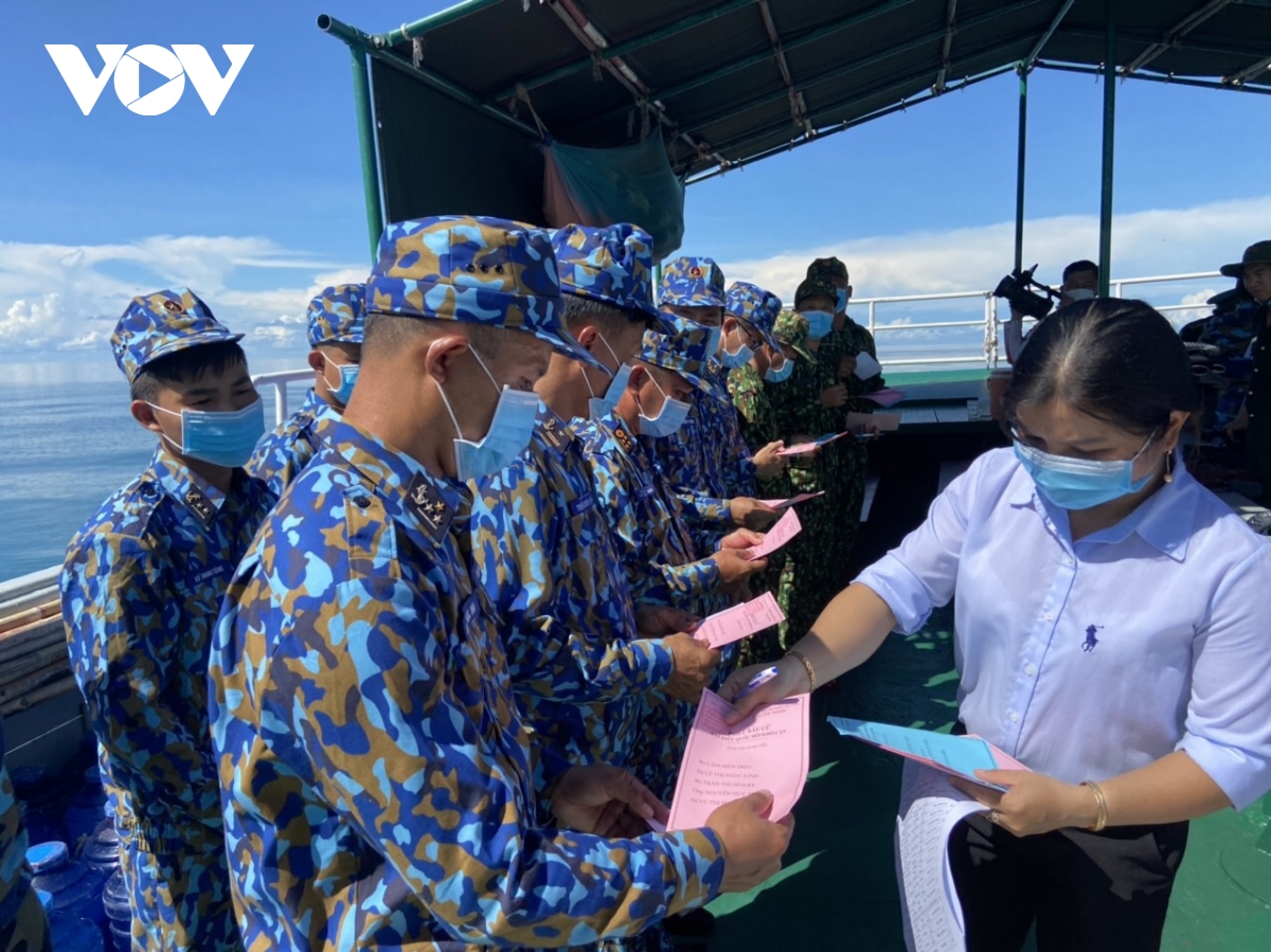 Vượt quãng đường hơn 15 hải lý, Tổ Bầu cử đã tiếp cận Tàu Cảnh sát Biển 3001 và Tàu Vạn Hoa 792, vùng 5 Hải quân để thực hiện quy trình bầu cử sớm trong không khí nghiêm túc, trang trọng, đúng luật định.