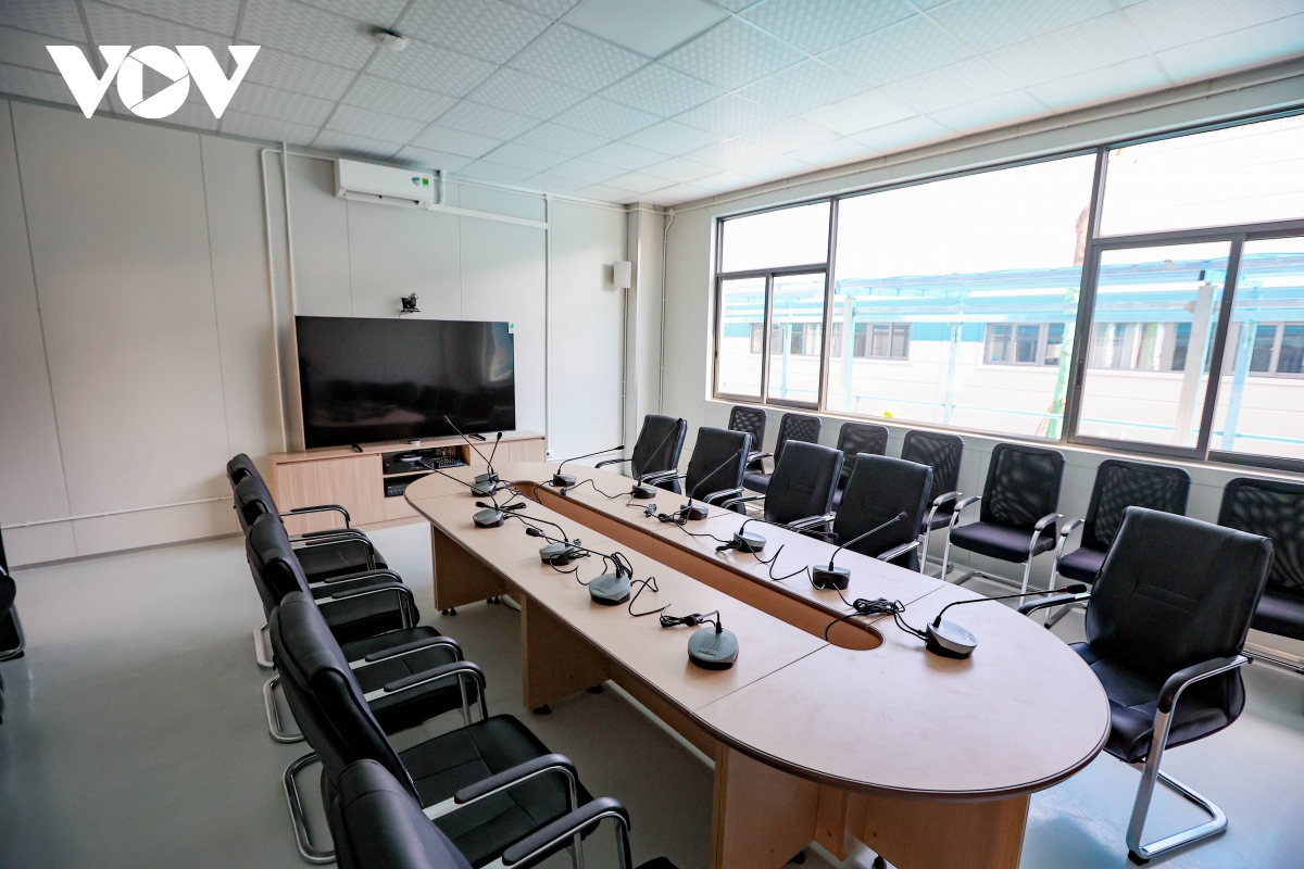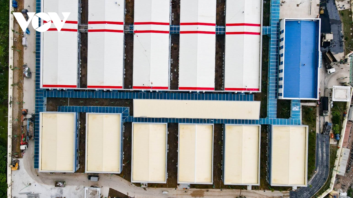 Bệnh viện được chia thành 3 khu: Khu nhà màu xanh là khu hành chính, phải bảo đảm không nhiễm khuẩn; khu nhà màu vàng là khu dinh dưỡng-nghỉ ngơi-xét nghiệm, test định kỳ-kho vật tư thiết bị y tế; khu đỏ dành cho bệnh nhân nặng điều trị ICU. |