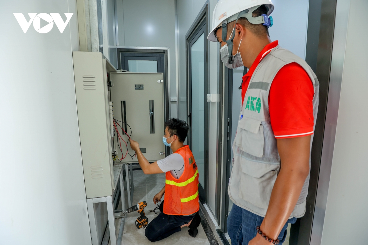 Sau hơn 1 tháng thần tốc thi công, Bệnh viện dã chiến Hoàng Mai đang trong những ngày nước rút để hoàn thiện các khâu cuối cùng để đưa vào hoạt động. |