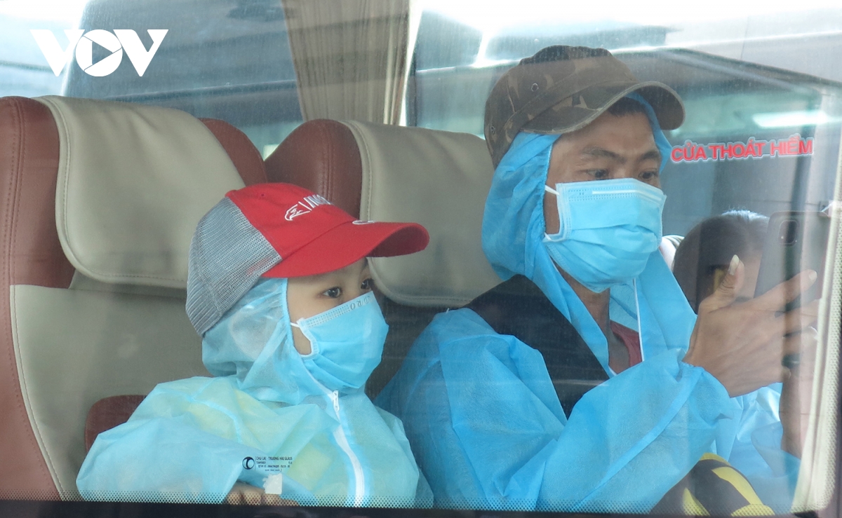 Người dân lên xe chuẩn bị về khu cách ly. |