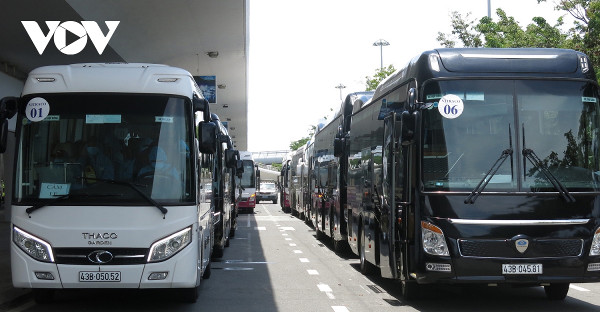 2 hàng xe ô tô ra đón bà con về quê. Xe 45 ghế nhưng mỗi xe chỉ chở tối đa 20 người để đảm bảo khoảng cách. |