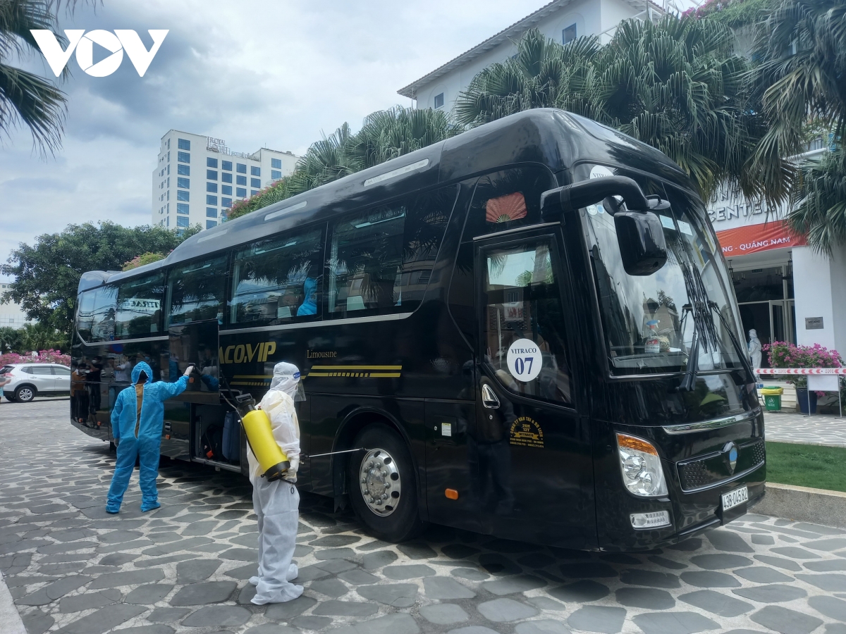 Khử khuẩn xe trước khi người dân trên xe vào khách sạn cách ly. |