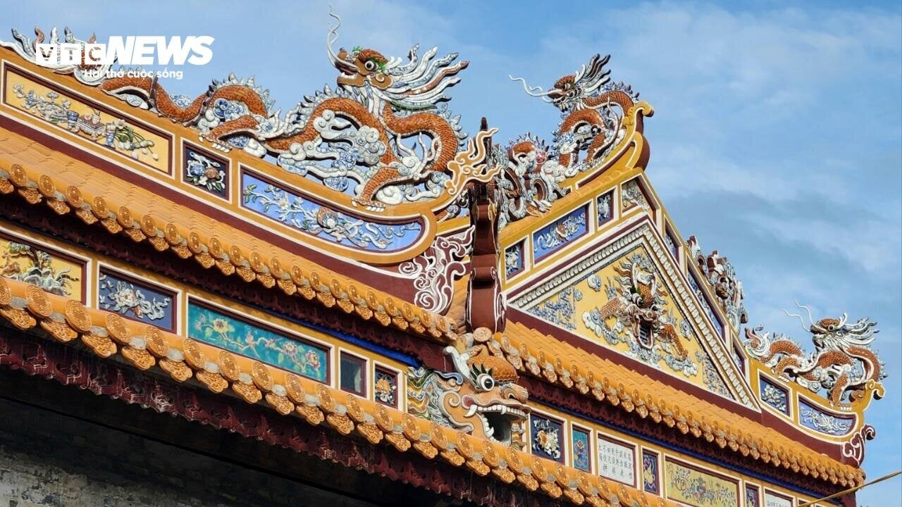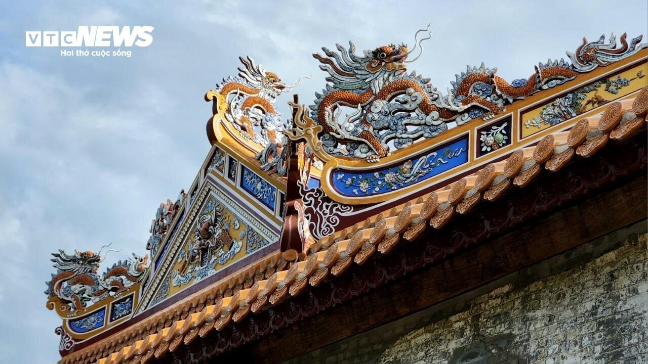 | Phần mái sau khi trùng tu với ngói lưu ly; hoạ tiết hình rồng, hoa lá... được làm sắc nét. Ảnh: ND |