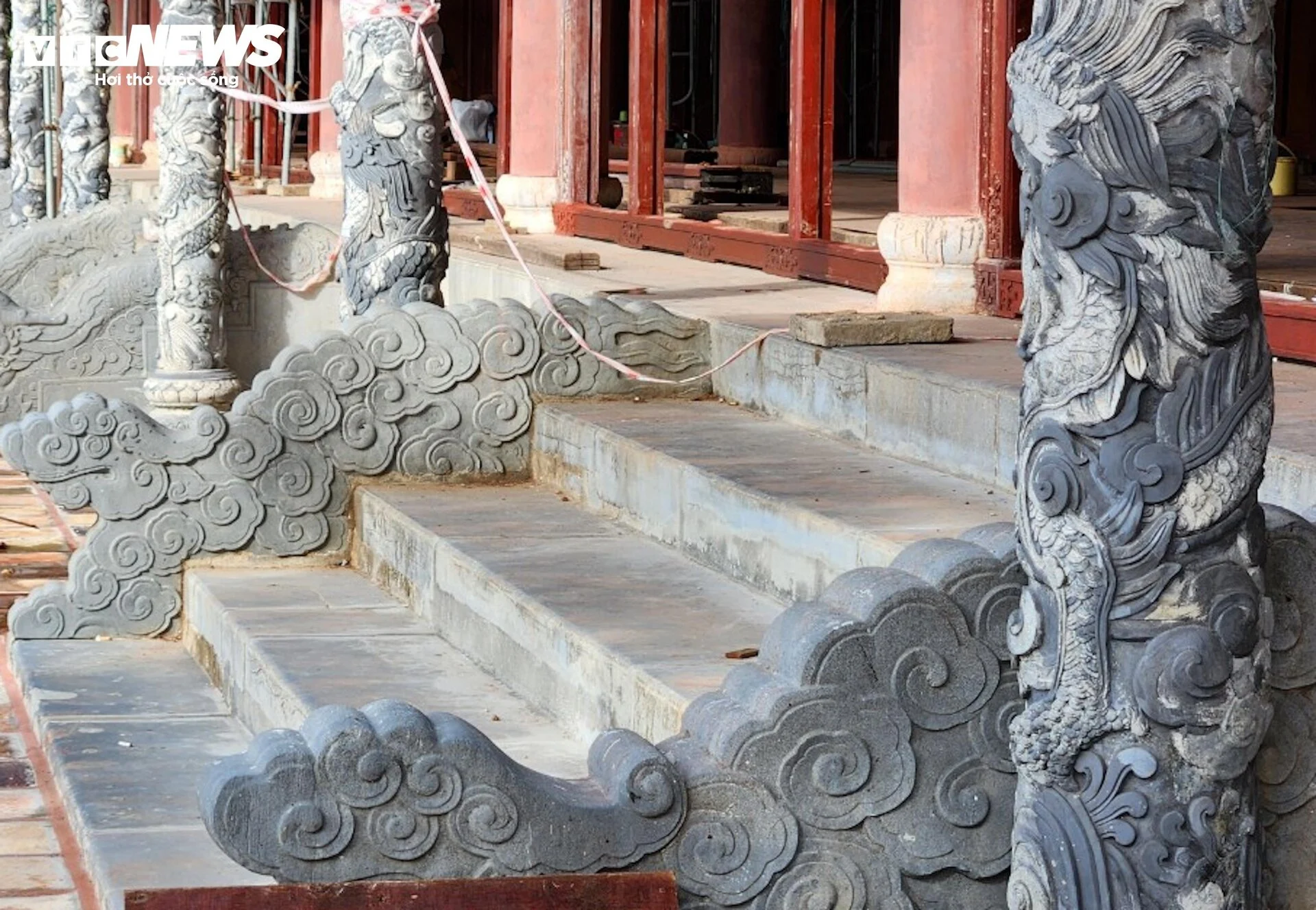 | Hệ thống cột, thềm đá cổ được bảo tồn nguyên vẹn sau khi điện Thái Hoà được trùng tu. |