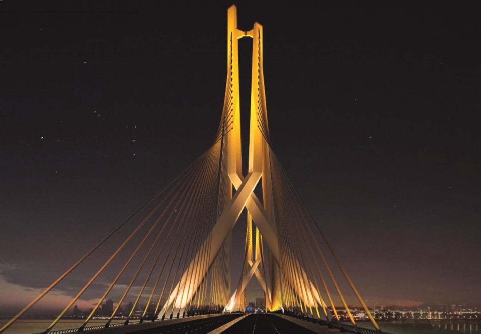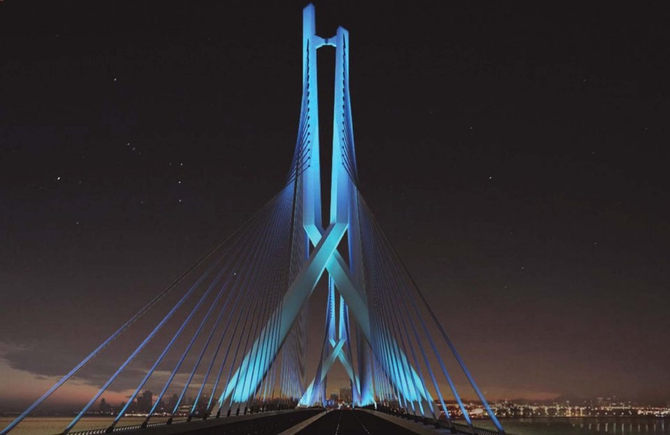 Nhịp cầu dài 1.000m, khoảng cách trụ 500m, đỉnh tháp cao 158m, chịu được động đất cấp 8.